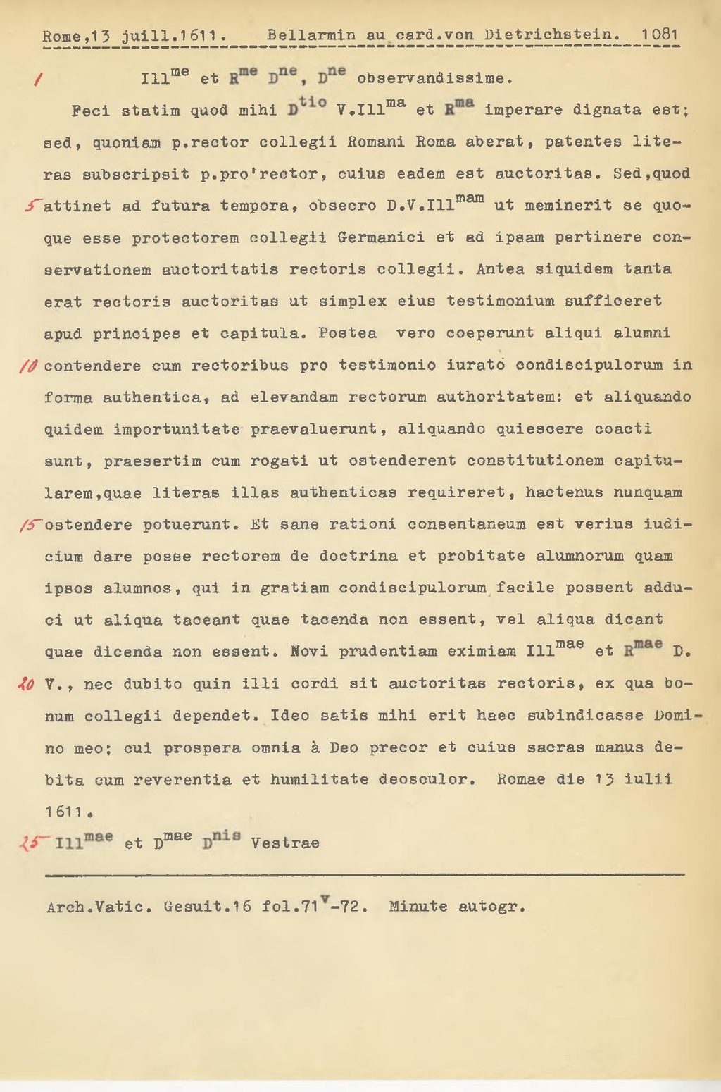 Feci statim quod mihi D.tio V.Ill.ma et R.ma imperare dignata est; sed, quondam p. rector collegii Romani Roma aberat, patentes literas subscripsit p. pro' rector, cuius eadem est auctoritas. Sed, quod attinet ad futura tempora, obsecro D.V. Ill.mam ut meminerit se quoque esse protectorem collegii Germanici et ad ipsam pertinere conservationem auctoritatis rectoris collegii. Antea siquidem tanta erat rectoris auctoritas ut simplex eius testimonium sufficeret apud principes et capitala. Postea vero coeperunt aliqui alumni contendere cum rectoribus pro testimonio iurato condiscipulorum in forma authentica, ad elevandam rectorum authoritatem: et aliquando quidem importunitate praevaluerunt, aliquando quiescere coacti sunt, praesertim cum rogati ut ostenderent constitutionem capitu iarem,quae literas illas authenticas requireret, hactenus nunquam estendere potuerunt. Et sane rationi consentaneum est verius iudicium dare posse rectorem de doctrina et probitate alumnorum quam ipsos alumnos, qui in gratiam condiscipulorum facile possent adduci ut aliqua taceant quae tacenda non essent, vel aliqua dicant quae dicenda non essent. Novi prudentiam eximiam Ill.mae et R.mae D. V., nec dubito quin illi cordi sit auctoritas rectoris, ex qua bonum collegii dependet. Ideo satis mihi erit haec subindicasse Domino meo; cui prospera omnia à Deo precor et cuius sacras manus debita cum reverentia et humilitate deosculor. Romae die 13 iulii 1611.