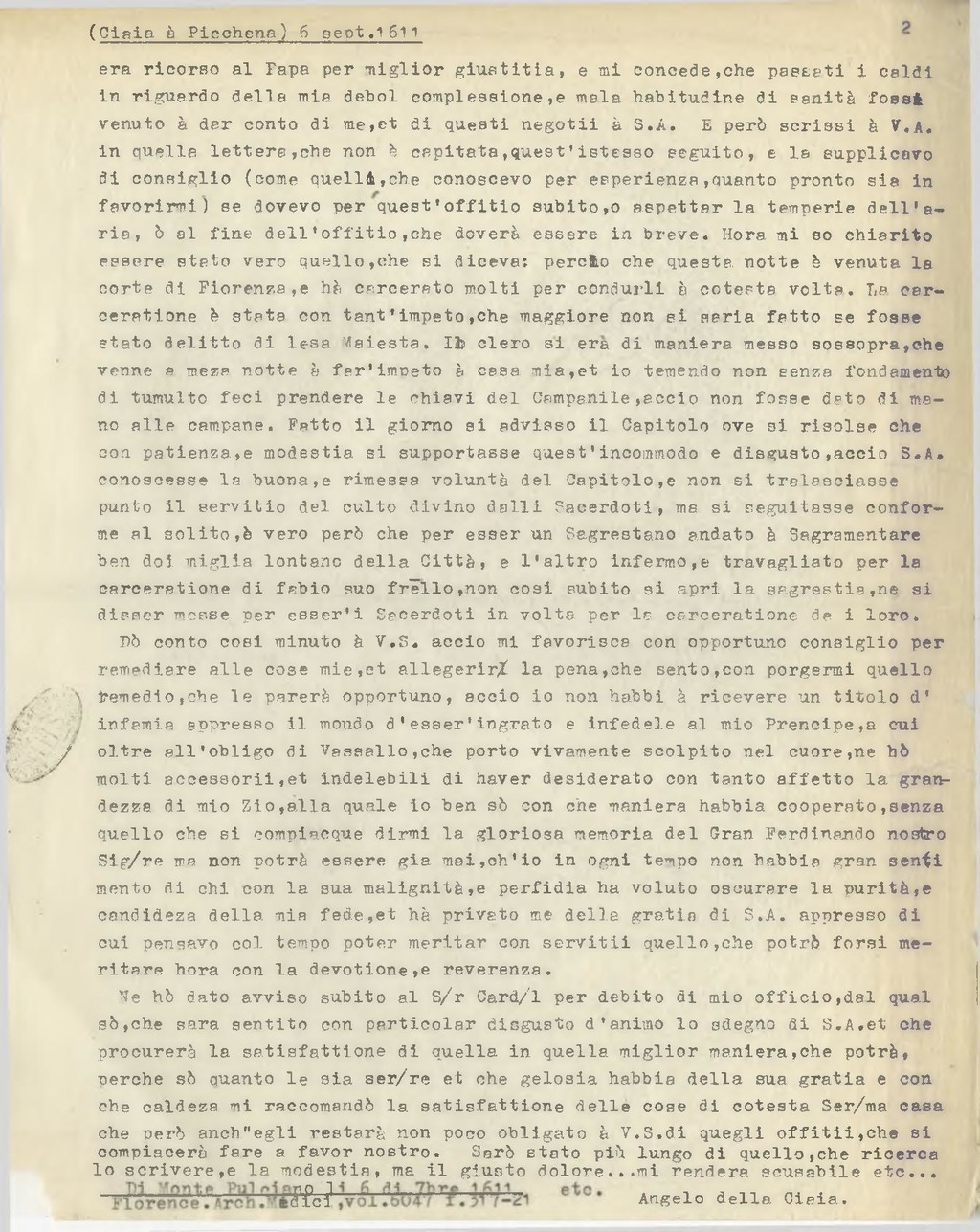 Do conto cosi minuto a V.S. acciò mi favorisca con opportuno consiglio per remediare alle cose mie, et allegerir la pena, che sento, con porgermi quello remedio, che le parerà opportuno, acciò io non habbi a ricevere un titolo d'infamia appresso il mondo d'esser'ingrato e infedele al mio Prencipe, a cui oltre all'obligo di Vassallo, che porto vivamente scolpito nel cuore, ne ho molti accessori, et indelebili di haver desiderato con tanto affetto la grandezza di mio Zio, alla quale io ben so con che maniera habbia cooperato, senza quello che si compiacque dirmi la gloriosa memoria del Gran Ferdinando nostro Sig.re ma non potrà essere già mai, ch'io in ogni tempo non habbia gran sentimento di chi con la sua malignità, e perfidia ha voluto oscurare la purità, e candideza della mia fede, et ha privato me della gratia di S.A. appresso di cui pensavo col tempo poter meritar con servitii quello, che potrò forsi meritare hora con la devotione, e reverenza.
