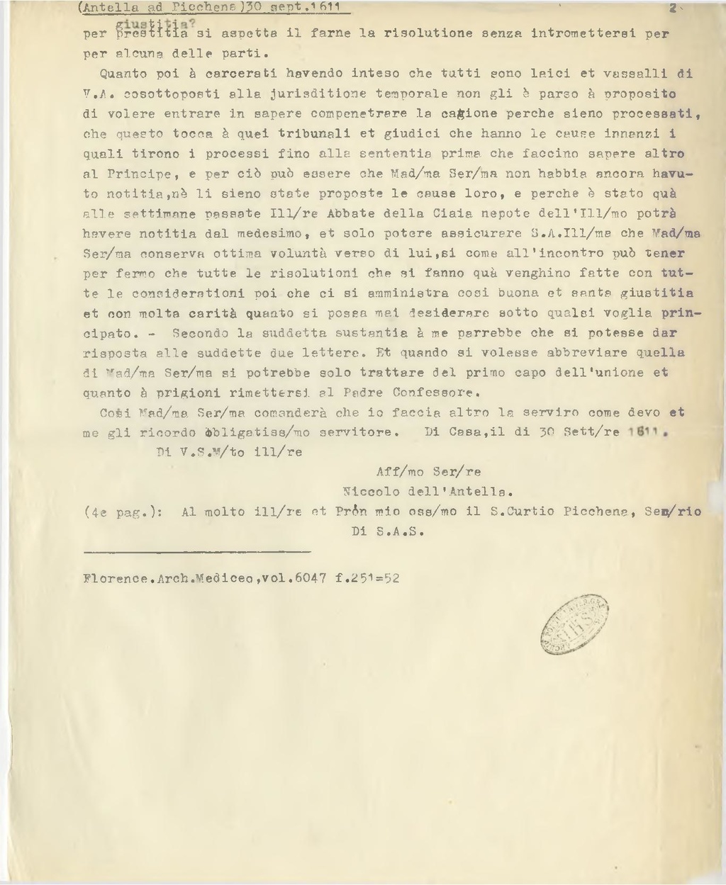 Così Mad.ma Ser.ma comanderà che io faccia altro la servirò come devo et me gli ricordo obligatiss.mo servitore. Di Casa, il dì 30 Sett.re 1611