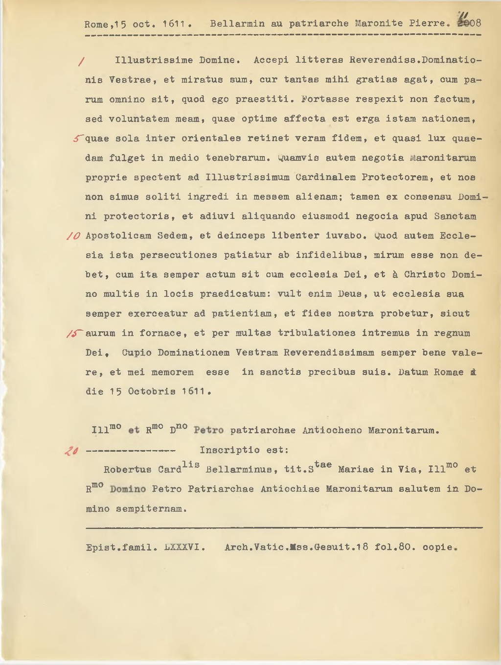 Robertus Card.lis Bellarminus, tit. S.tae Mariae in Via, Ill.mo et R.mo Petro Patriarchae Antiochiae Maronitarum salutem in Domino sempiternam.