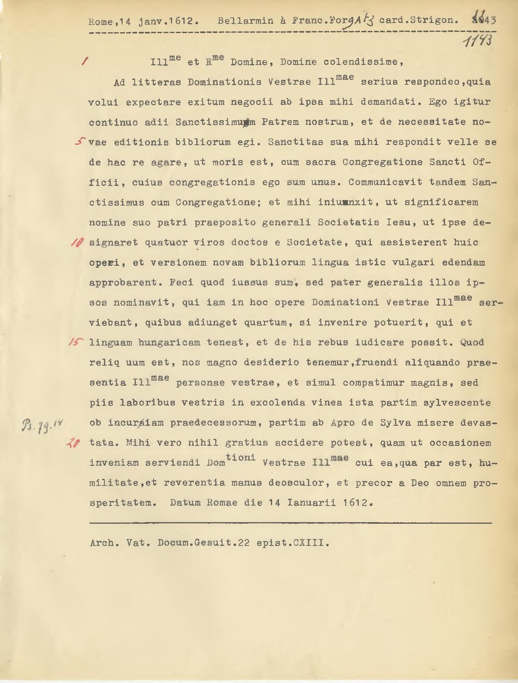 Ad litteras Dominationis Vestrae Ill.mae serius respondeo, quia volui expectare exitum negocii ab ipsa mihi demandati. Ego igitur continuo adii Sanctissimum Patrem nostrum, et de necessitate novae editionis bibliorum egi. Sanctitas sua mihi respondit velie se de hac re agare, ut moris est, cum sacra Congregatione Sancti Officii, cuius congregationis ego sum unus. Communlcavit tandem Sanctissimus cum Congregatione; et mihi iniunnxit, ut significarem nomine suo patri praeposito generali Societatis lesu, ut ipse designaret quatuor viros doctos e Societate, qui assisterent huic opeci, et versionem novam bibliorum lingua istic vulgari edendam approbarent. Feci quod iussus sum, sed pater generalis illos ipsos nominavit, qui iam in hoc opere Dominationi Vestrae Ill.mae serviebant, quibus adiunget quartum, si invenire potuerit, qui et linguam hungaricam teneat, et de his rebus iudicare possit. Quod reliquum est, nos magno desiderio tenemur,fruendi aliquando praesentia Ill.mae personae vestrae, et simul compatimur magnis, sed piis laboribus vestris in excolenda vinea ista partim sylvescente ob incuriam praedecessorum, partim ab Apro de Sylva misere devastata. Mihi vero nihil gratius accidere potest, quam ut occasionem inveniam serviendi Dom.tioni Vestrae Ill.mae cui ea, qua par est, humilitate, et reverentia manus deosculor, et precor a Deo omnem prosperitatem. Datum Romae die 14 lanuarii 1612.