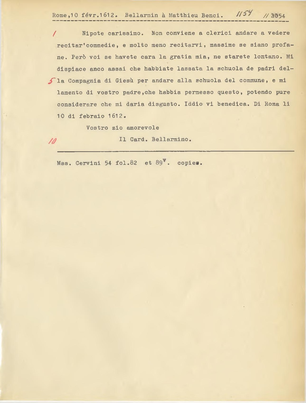 Nipote carissimo. Non conviene a clerici andare a vedere recitar'commedie, e molto meno recitarvi, massime se siano profane. Però voi se havete cara la gratia mia, ne starete lontano. Mi dispiace anco assai che hahbiate lassata la schuola de padri della Compagnia di Giesù per andare alla schuola del commune, e mi lamento di vostro padre, che habbia permesso questo, potendo pure considerare che mi daria disgusto. Iddio vi benedica. Di Roma li 10 di febraio 1612.
