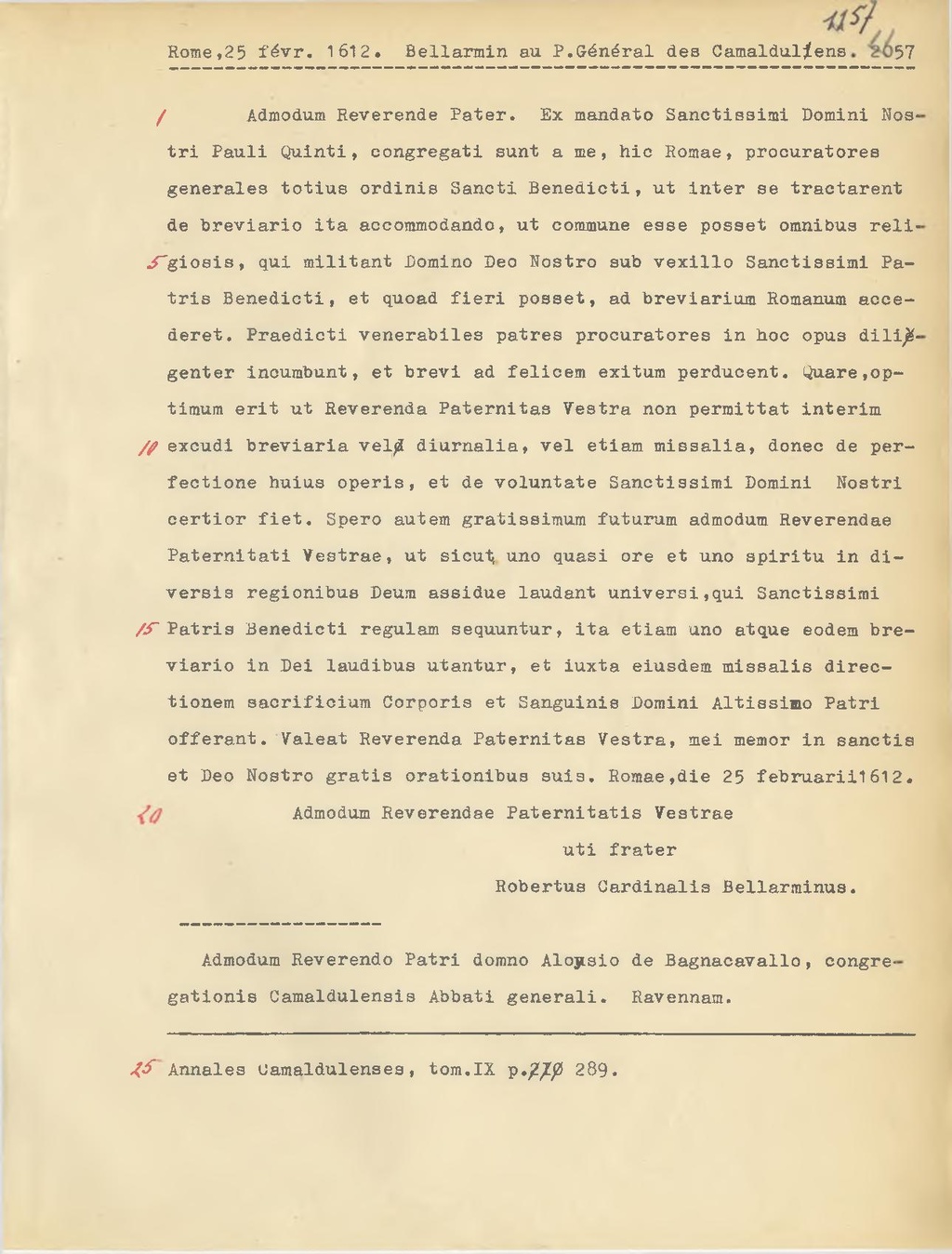 Admodum Reverende Pater. Ex mandato Sanctissimi Domini Nostri Pauli Quinti, congregati sunt a me, hic Romae, procuratores generales totius ordinis Sancti Benedicti, ut inter se tractarent de breviario ita accommodando, ut commune esse posset omnibus religiosis, qui militant Domino Deo Nostro sub vexillo Sanctissimi Patrie Benedicti, et quoad fieri posset, ad breviarium Romanum accederet. Praedicti venerabiles patres procuratores in hoc opus diligenter incumbunt, et brevi ad felicem exitum perducent. Quare, optimum erit ut Reverenda Paternitas Vestra non permittat interim excudi breviaria vel diurnalia, vel etiam missalia, donec de perfectione huius operis, et de voluntate Sanctissimi Domini Nostri certior fiet. Spero autem gratissimum futurum admodum Reverenda Paternitati Vestrae, ut sicut uno quasi ore et uno spiritu in diversis regionibus Deum assidue laudani universi, qui Sanctissimi Patrie Benedicti regulam sequuntur, ita etiam uno atque eodem bre viario in Dei laudibus utantur, et iuxta eiusdem missalis directionem sacrificium Corporis et Sanguinis Domini Altissimo Patri offerant. Valeat Reverenda Paternitas Vestra, mei memor in sanctis et Deo Nostro gratis orationibus suis. Romae,die 25 februarii1612.
