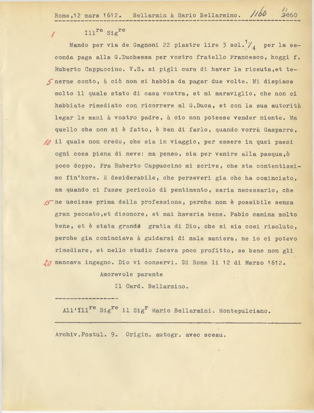 All'Ill.re Sig.re il Sig.r Mario Bellarmini. Montepulciano.