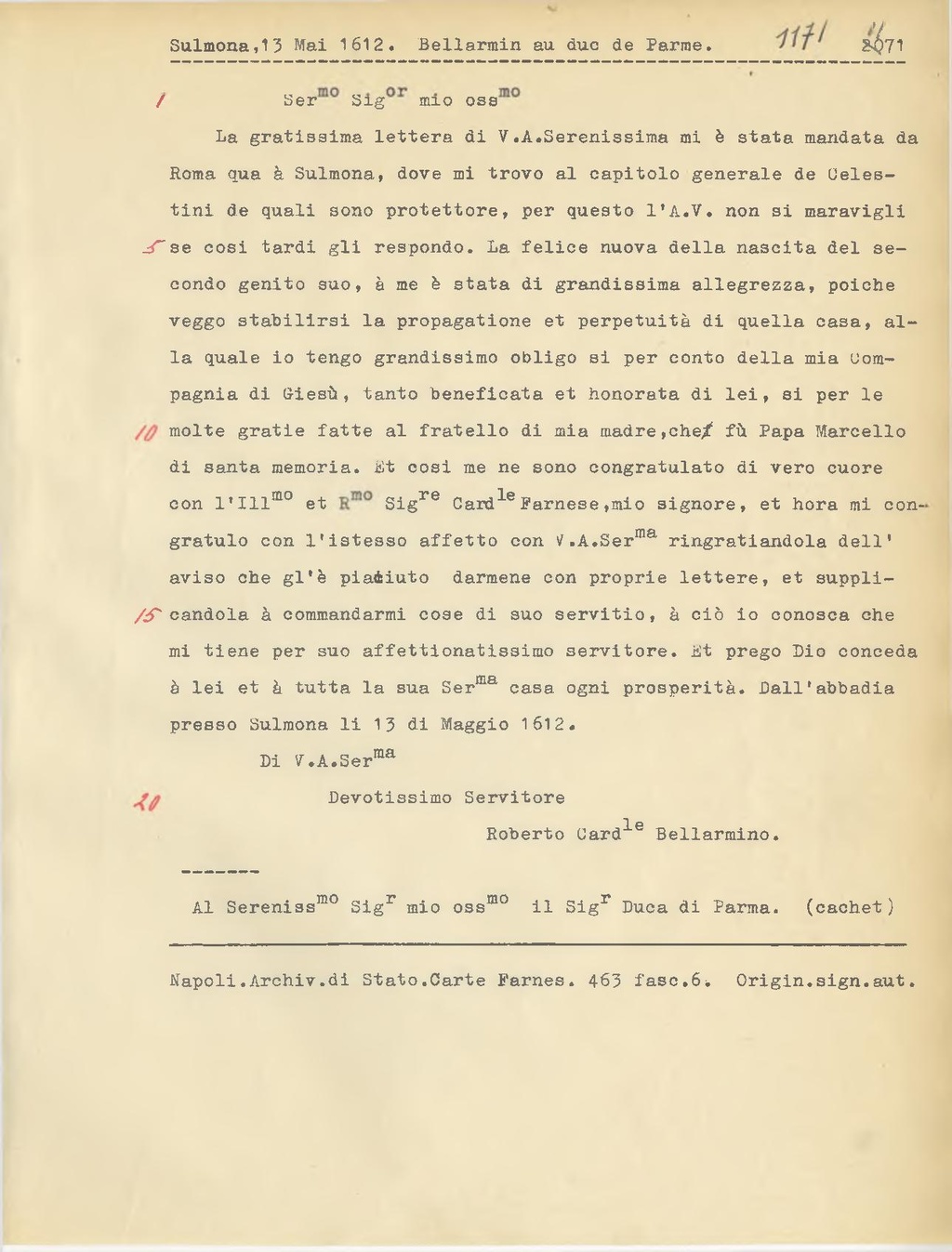 La gratissima lettera di V.A.Serenissima mi è stata mandata da Roma qua a Sulmona, dove mi trovo al capitolo generale de Celestini de quali sono protettore, per questo l'A.V. non si maravigli se cosi tardi gli respondo. La felice nuova della nascita del secondo genito suo, a me è stata di grandissima allegrezza, poichè veggo stabilirsi la propagatione et perpetuità di quella casa, alla quale io tengo grandissimo obligo si per conto della mia Compagnia di Giesù, tanto beneficata et honorata di lei, si per le molte grafie fatte al fratello di mia madre, che fù Papa Marcello di santa memoria. Et così me ne sono congratulato di vero cuore con l'Ill.mo et R.mo Sig.re Card.le Farnese, mio signore, et hora mi congratulo con l'istesso affetto con V.A. Ser.ma ringraziandola dell'aviso che gl'è piaciuto darmene con proprie lettere, et supplicandola à commandarmi cose di suo servitio, à ciò io conosca che mi tiene per suo affettionatissimo servitore. Et prego Dio conceda a lei et a tutta la sua Ser.ma casa ogni prosperità. Dall'abbadia presso Sulmona li 13 di Maggio 1612.