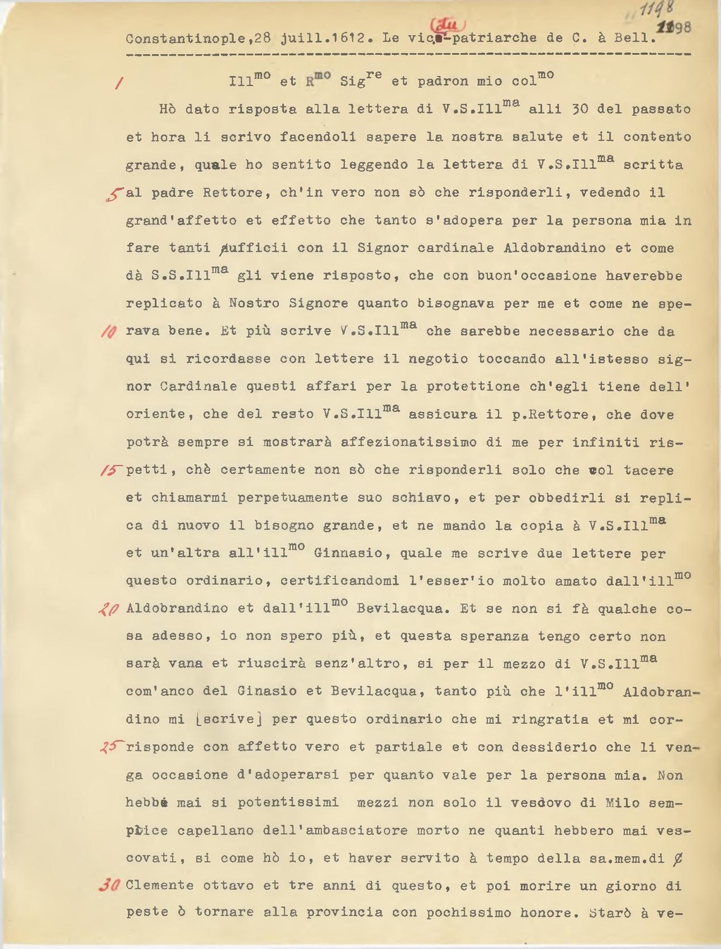 Hò dato risposta alla lettera di V.S.Ill.ma alli 30 del passato et hora li scrivo facendoli sapere la nostra salute et il contento grande, quale ho sentito leggendo la lettera di V.S. Ill.ma scritta al padre Rettore, ch'in vero non so che risponderli, vedendo il grand'affetto et effetto che tanto s'adopera per la persona mia in fare tanti ufficii con il Signor cardinale Aldobrandino et come dà S.S. Ill.ma gli viene risposto, che con buon'occasione haverebbe