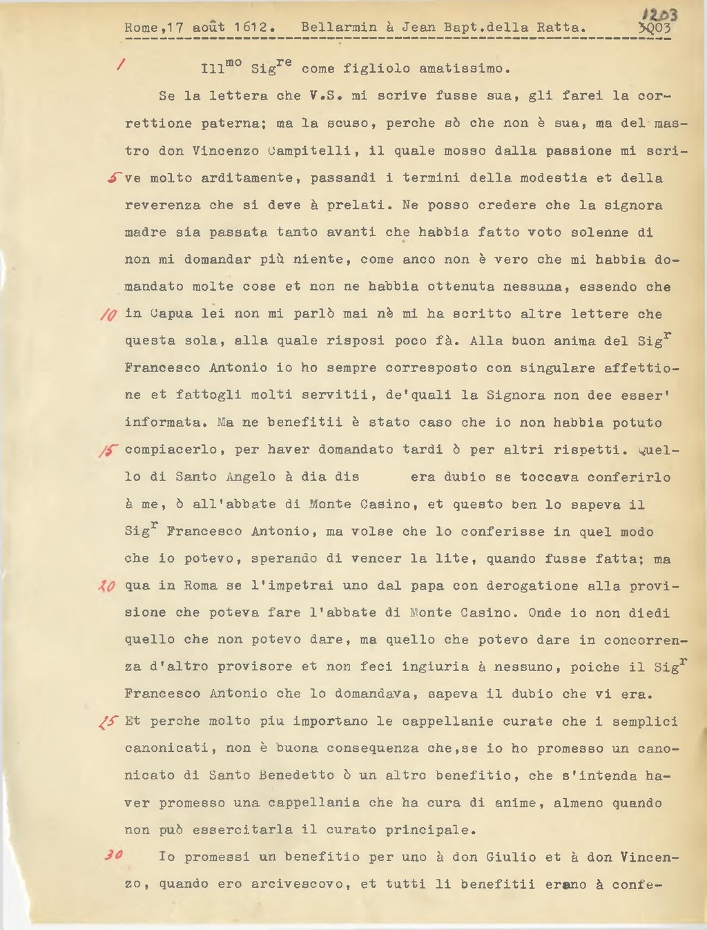 Se la lettera che V.S. mi scrive fusse sua, gli farei la correttione paterna; ma la scuso, perche sò che non è sua, ma del mastro don Vincenzo Campitelli, il quale mosso dalla passione mi scrive molto arditamente, passandi i termini della modestia et della reverenza che si deve à prelati. Ne posso credere che la signora madre sia passata tanto avanti che habbia fatto voto solenne di non mi domandar più niente, come anco non è vero che mi habbia domandato molte cose et non ne habbia ottenuta nessuna, essendo che in Capua lei non mi parlò mai nè mi ha scritto altre lettere che