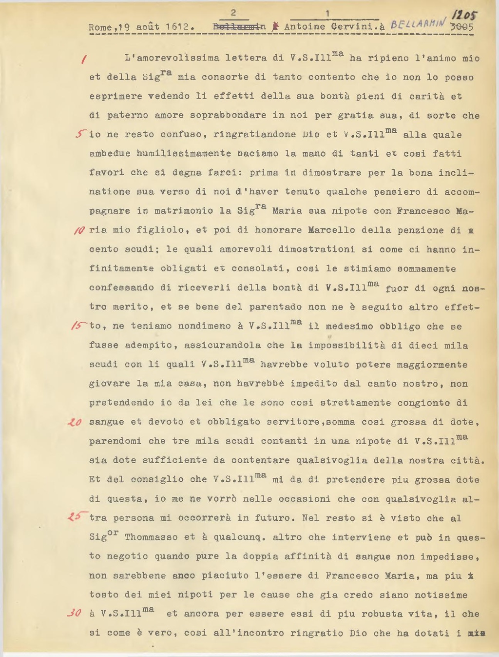 L'amorevolissima lettera di V.S. Ill.ma ha ripieno l'animo mio et della Sig.ra mia consorte di tanto contento che io non lo posso esprimere vedendo li effetti della sua bontà pieni di carità et di paterno amore soprabbondare in noi per gratia sua, di sorte che io ne resto confuso, ringratiandone Dio et V.S. Ill.ma alla quale ambedue humilissimamente baciamo la mano di tanti et cosi fatti favori che si degna farci: prima in dimostrare per la bona inclinatione sua verso di noi d'haver tenuto qualche pensiero di accompagnare in matrimonio la Sig.ra Maria sua nipote con Francesco Maria mio figliolo, et poi di honorare Marcello della pensione di cento scudi; le quali amorevoli dimostrationi si come ci hanno in finitamente obligati et consolati, cosi le stimiamo sommamente confessando di riceverli della bontà di V.S. Ill.ma fuor di ogni nostro merito, et se bene del parentado non ne è seguito altro effetto, ne teniamo nondimeno à V.S. Ill.ma il medesimo obbligo che se fusse adempito, assicurandola che la impossibilità di dieci mila scudi con li quali V.S. Ill.ma havrebbe voluto potere maggiormente giovare la mia casa, non havrebbe impedito dal canto nostro, non pretendendo io da lei che le sono così strettamente congionto di sangue et devoto et obbligato servitore, somma cosi grossa di dote, parendomi che tre mila scudi contanti in una nipote di V.S. Ill.ma sia dote sufficiente da contentare qualsivoglia della nostra città. Et del consiglio che V.S. Ill.ma mi da di pretendere piu grossa dote di questa, io me ne vorrò nelle occasioni che con qualsivoglia altra persona mi occorrerà in futuro. Nel resto si è visto che al Sig.or Thommasso et a qualcunq. altro che interviene et può in questo negotio quando pure la doppia affinità di sangue non impedisse, non sarebbene anco piaciuto l'essere di Francesco Maria, ma piu i tosto dei miei nipoti per le cause che già credo siano notissime a V.S. Ill.ma et ancora per essere essi di più robusta vita, il che si come è vero, così all'incontro ringrazio Dio che ha dotati i
