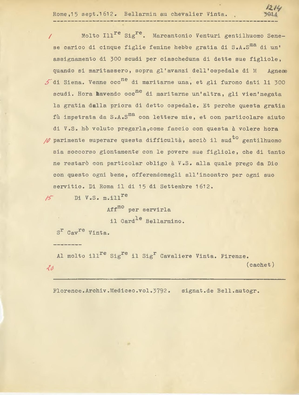 Molto Ill.re Sig.re. Marcantonio Venturi gentilhuomo Sene se carico di cinque figlie femine hebbe gratia di S.A. S.ma di un'assignamento di 300 scudi per ciascheduna di dette sue figliole, quando si maritassero, sopra gl'avanzi dell'ospedale di M Agnese di Siena. Venne occ.ne di maritarne una, et gli furono dati li 300 scudi. Hora havendo occ.ne di maritarne un'altra, gli vien'negata la gratia dalla priora di detto ospedale. Et perchè questa gratia fù impetrata da S.A.S.ma con lettere mie, et con particolare aiuto di V.S. ho voluto pregarla,come faccio con questa a volere hora parimente superare questa difficultà, acciò il sud.to gentilhuomo sia soccorso giontamente con le povere sue figliole, che di tanto ne restarò con particolar obligo a V.S. alla quale prego da Dio con questo ogni bene, offerendomegli all'incontro per ogni suo servitio. Di Roma il di 15 di Settembre 1612.