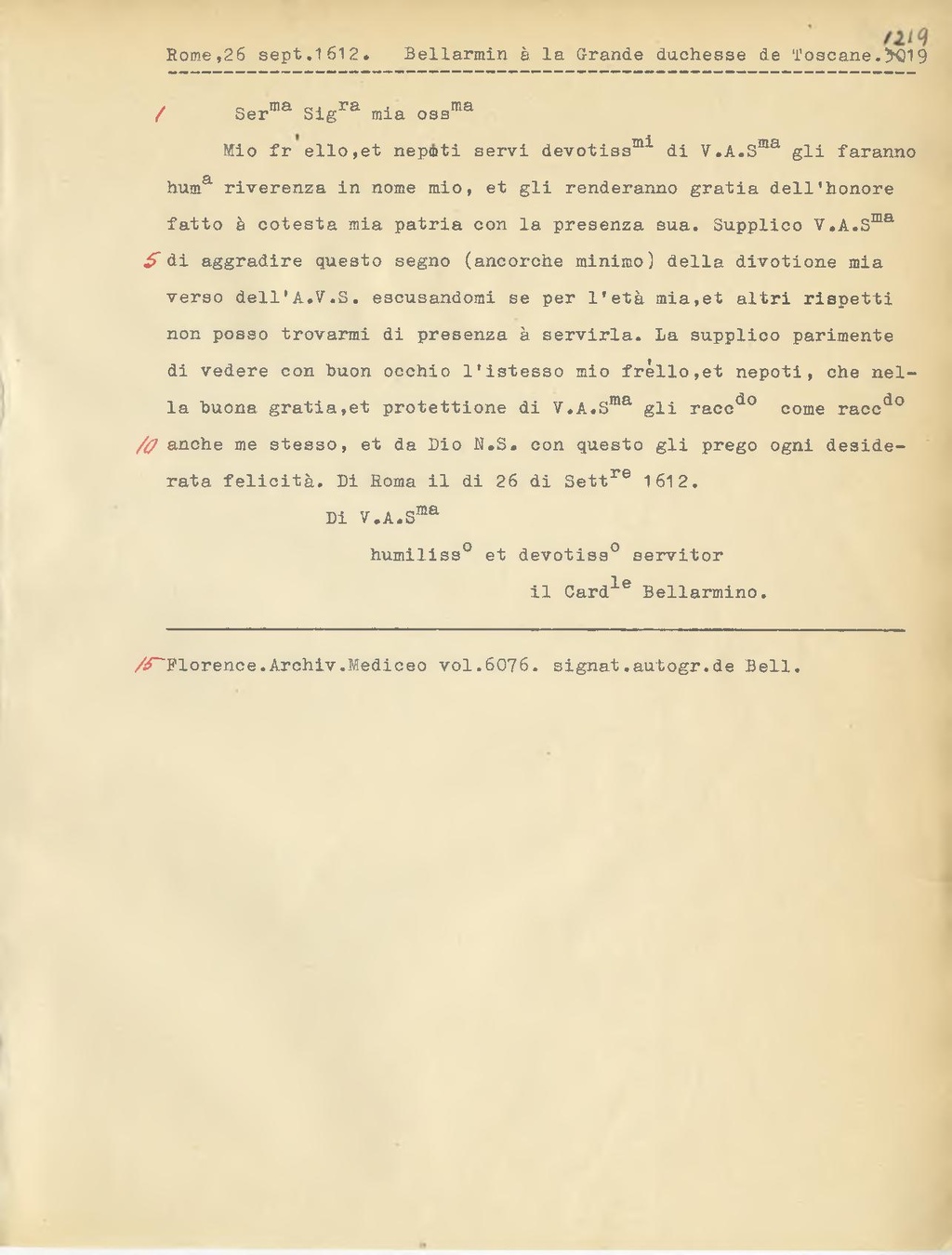 Mio fr'elo, et nepoti servi devotiss.mi di V.A. S.ma gli faranno hum.a riverenza in nome mio, et gli renderanno gratia dell'honore fatto a cotesta mia patria con la presenza sua. Supplico V.A. S.ma di aggradire questo segno (ancorchè minimo) della divotione mia verso dell'A.V.S. escusandomi se per l'età mia, et altri rispetti non posso trovarmi di presenza a servirla. La supplico parimente di vedere con buon occhio l'istesso mio fr.ello, et nepoti, che nel la buona gratia, et protettione di V.A.S.ma gli racc.do come racc.do anche me stesso, et da Dio N.S. con questo gli prego ogni desiderata felicità. Di Roma il di 26 di Sett.re 1612.