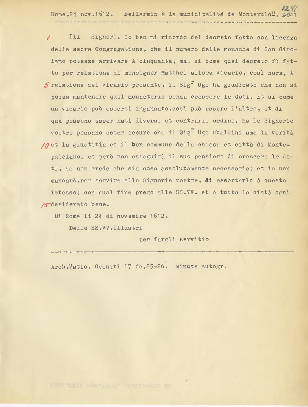 Ill. Signori. Io ben mi ricordo del decreto fatto con licenza della sacra Congregatione, che il numero delle monache di San Girolamo potesse arrivare à cinquanta, ma, si come quel decreto fù fatto per relatione di monsignor Matthei allora vicario, così hora, à relatione del vicario presente, il Sigr Ugo ha giudicato che non si possa mantenere quel monasterio senza crescere le doti. Et si come un vicario può essersi ingannato, così può essere l'altro, et di qua possono esser nati diversi et contrarii ordini. Ma le Signorie vostre possano esser secure che il Sigr Ugo Ubaldini ama la verità et la giustitia et il ben commune della chiesa et città di Montepulciano; et però non esseguirà il suo pensiero di crescere le doti, se non crede che sia cosa assolutamente necessaria; et io non mancarò, per servire alle Signorie vostre, di essortarlo à questo istesso; con qual fine prego alle SS. VV. et à tutta la città ogni desiderato bene.