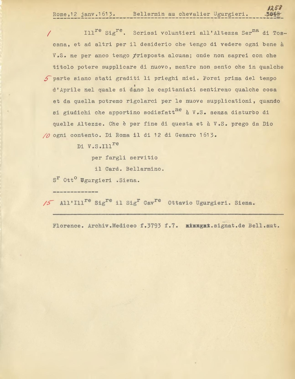 All'Ill.re il Sig.r Cavre Ottavio Ugurgieri. Siena.