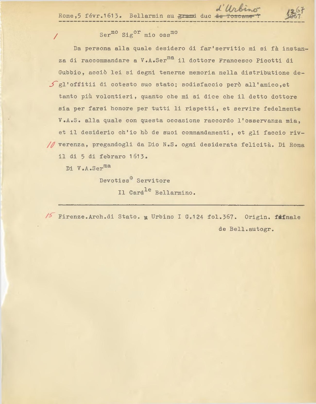 Da persona alla quale desidero di far'servitio mi si fà instanza di raccommandare a V. A. Ser.ma il dottore Francesco Picotti di Gubbio, acciò lei si degni tenerne memoria nella distributione degl'offitii di cotesto suo stato; sodisfaccio però all'amico, et tanto più volontieri, quanto che mi si dice che il detto dottore sia per farsi honore per tutti li rispetti, et servire fedelmente V. A. S. alla quale con questa occasione raccordo l'osservanza mia, et il desiderio ch'io hò de suoi commandamenti, et gli faccio riverenza, pregandogli da Dio N.S. ogni desiderata felicità. Di Roma il di 5 di febraro 1613.