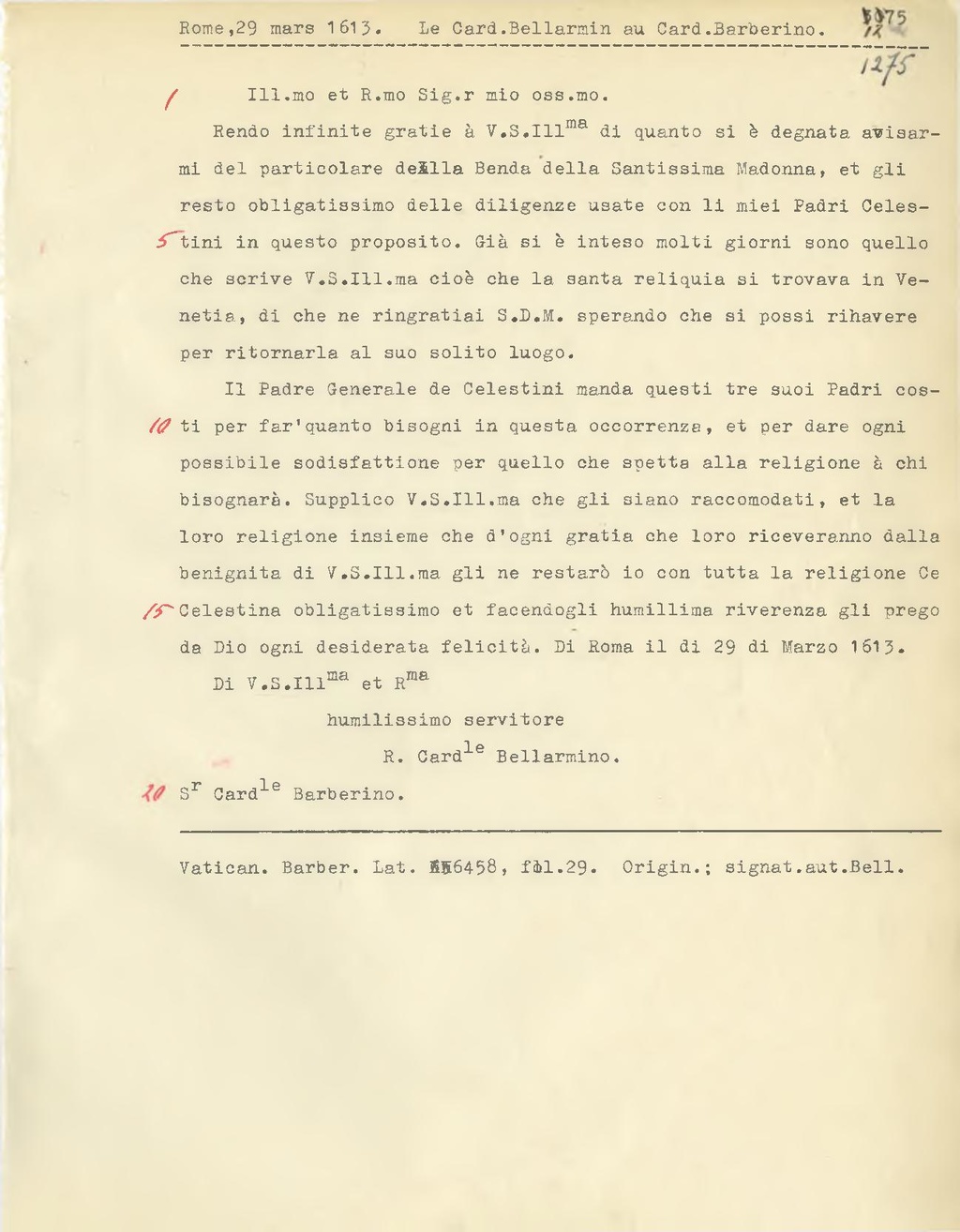 Il Padre Generale de Celestini manda questi tre suoi Padri costi per far'quanto bisogni in questa occorrenza, et per dare ogni possibile sodisfattione per quello che spetta alla religione à chi bisognarà. Supplico V.S. Ill.ma che gli siano raccomodati, et la loro religione insieme che d'ogni gratin che loro riceveranno dalla benignità di V.S. Ill.ma gli ne restarà io con tutta la religione Celestina obligatissimo et facendogli humillima riverenza gli prego da Dio ogni desiderata felicità. Di Roma il di 29 di Marzo 1613.