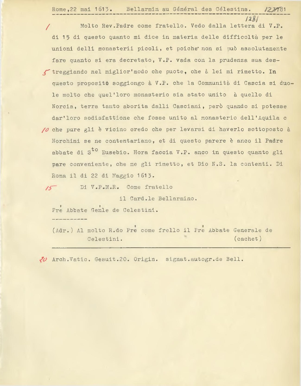 Molto Rev. Padre come fratello. Vedo dalla lettera di V. P. di 15 di questo quanto mi dice in materia delle difficoltà per le unioni delli monasterii picoli, et poiche non si può assolutamente fare quanto si era decretato, V. P. vada con la prudenza sua destreggiando nel miglior'modo che puote, che à lei mi rimetto.[1] In questo proposito soggiongo à V. P. che la Comunità di Cascia si duole molto che quel'loro monasterio sia stato unito à quello di Norcia, terra tanto aborita dalli Casciani, però quando si potesse dar'loro sodisfattione che fosse unito al monasterio dell'Aquila o che pure gli è vicino credo che per levarsi di haverlo sottoposto à Norchini se ne contentariano, et di questo parere è anco il Padre abbate di S.to Eusebio. Hora faccia V. P. anco in questo quanto gli pare conveniente, che me gli rimetto, et Dio N. S. la contenti. Di Roma il di 22 di Maggio 1613.