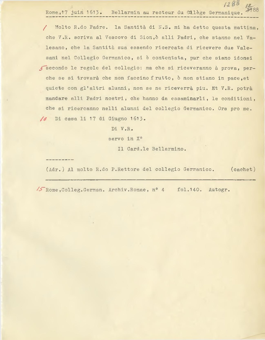 Molto R.do Padre, la Santità di N. S. mi ha detto questa mattina, che V. R. scriva al Vescovo di Sion, ò alli Padri, che stanno nel Valesano, che la Santità sua essendo ricercata di ricevere due Valesani nel Collegio Germanico, si è contentata, pur che siano idonei secondo le regole del collegio: ma che si riceveranno à prova, perche se si troverà che non faccino frutto, ò non stiano in pace, et quiete con gl'altri alunni, non se ne riceverrà piu. Et V. R. potrà mandare alli Padri nostri, che hanno da essaminarli, le conditioni, che si ricercanno nelli alunni del collegio Germanico. Ora pro me. Di casa li 17 di Giugno 1613.