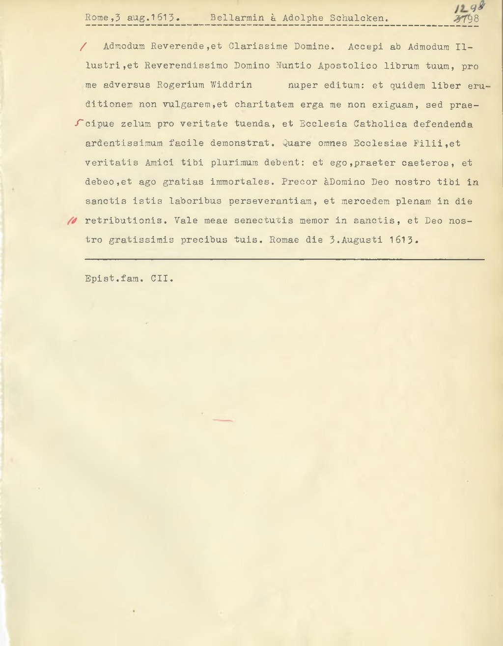 Admodum Reverende, et Clarissime Domine. Accepi ab Admodum Illustri, et Reverendissimo Domino Nuntio Apostolico librum tuum, pro me adversus Rogerium Widdrin nuper editum: et quidem liber eruditionem non vulgarem, et charitatem erga me non exiguam, sed praecipue zelum pro veritate tuenda, et Ecclesia Catholica defendenda ardentissimum facile demonstrat. Quare omnes Ecclesiae Filii, et veritatis Amici tibi plurimum debent: et ego, praeter caeteros, et debeo, et ago gratias immortales. Precor à Domino Deo nostro tibi in sanctir istis laboribus perseverantiam, et mercedem plenam in die retributionis. Vale meae senectutis memor in sanctis, et Deo nostro gratissimis precibus tuis. Romae die 3. Augusti 1613.