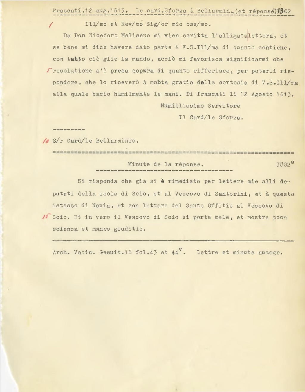 Da Don Niceforo Meliseno mi vien scritta l'alligata lettera, et se bene mi dice havere dato parte à V. S. Ill.ma di quanto contiene, con tutto ciò glie la mando, acciò mi favorisca significarmi che resolutione s'è presa sopra di quanto rifferisce, per poterli rispondere, che lo riceverò à molta gratia dalla cortesia di V. S. Ill.ma alla quale bacio humilmente le mani. Di frascati li 12 Agosto 1613.