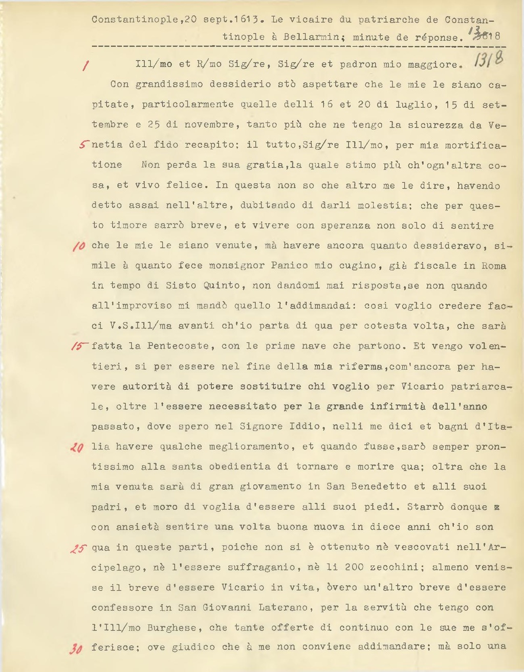 Con grandissimo dessiderio stò aspettare che le mie le siano capitate, particolarmente quelle delli 16 et 20 di luglio, 15 di settembre e 25 di novembre, tanto più che ne tengo la sicurezza da Venetia del fido recapito; il tutto, Sig.re Ill.mo, per mia mortificatione Non perda la sua gratia, la quale stimo più ch'ogn'altra cosa, et vivo felice. In questa non so che altro me le dire, havendo detto assai nell'altro, dubitando di darli molestia; che per questo timore sarrò breve, et vivere con speranza non solo di sentire che le mie le siano venute, ma bavere ancora quanto dessideravo, simile à quanto fece monsignor Panico mio cugino, già fiscale in Roma in tempo di Sisto Quinto, non dandomi mai risposta, se non quando all'improviso mi mandò quello l'addimandai: cosi voglio credere facci V.S. Ill.ma avanti ch'io parta di qua per cotesta volta, che sarà fatta la Pentecoste, con le prime nave che partono. Et vengo volentieri, si per essere nel fine della mia riferma, com'ancora per ba vere autorità di potere sostituire chi voglio per Vicario patriarcale, oltre l'essere necessitato per la grande infirmità dell'anno passato, dove spero nel Signore Iddio, nelli me dici et bagni d'Italia bavere qualche meglioramento, et quando fusse, sarà semper prontissimo alla santa obedientia di tornare e morire qua; oltra che la mia venuta sarà di gran giovamento in San Benedetto et alli suoi padri, et moro di voglia d'essere alli suoi piedi. Starrò donque con ansietà sentire una volta buona nuova in diece anni ch'io son qua in queste parti, poichè non si è ottenuto nè vescovati nell'Arcipelago, nè l'essere suffraganio, nè li 200 zecchini; almeno venisse il breve d'essere Vicario in vita, òvero un'altro breve d'essere confessore in San Giovanni Laterano, per la servitù che tengo con l'Ill/mo Burghese, che tante offerte di continuo con le sue me s'offerisce; ove giudico che à me non conviene addimandare; mà solo una