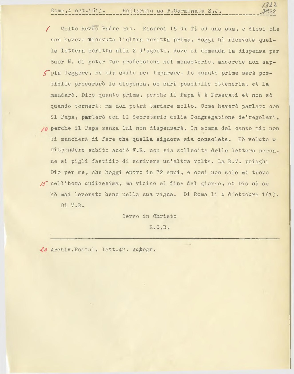 Molto Rev.do Padre mio. Risposi 15 di fà ad una sua, e dissi che non havevo ricevuta l'altra scritta prima. Hoggi hò ricevuta quella lettera scritta alli 2 d'agosto, dove si domanda la dispensa per Suor N. di poter far professione nel monasterio, ancorchè non sappia leggere, ne sia abile per imparare. Io quanto prima sarà possibile procurar la dispensa, se sarà possibile ottenerla, et la mandaró. Dico quanto prima, perche il Papa è à Frascati et non sò quando tornerà; ma non potrà tardare molto. Come haverò parlato con il Papa, parlerò con il Secretario della Congregatione de'regolari, perche il Papa senza lui non dispensarà. In somma dal canto mio non si mancherà di fare che quella signora sia consolata. Hò voluto rispondere subito acciò V. R. non sia sollecita della lettera persa, ne si pigli fastidio di scrivere un'altra volta. La R.V. prieghi Dio per me, che hoggi entro in 72 anni, e cosi non solo mi trovo nell’hora undicesima, ma vicino al fine del giorno, et Dio sà se hò mai lavorato bene nella sua vigna. Di Roma li 4 d'ottobre 1613.