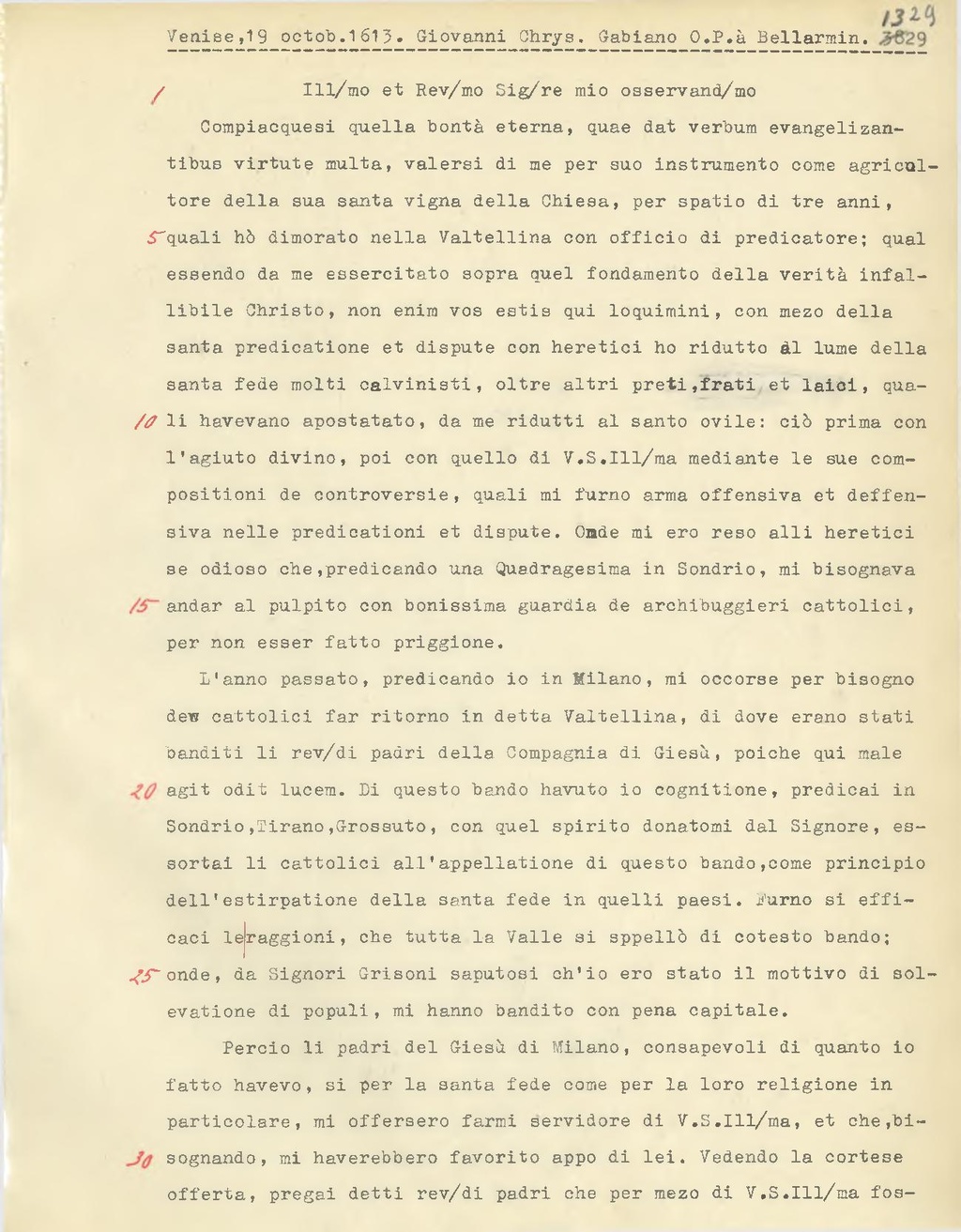 Compiacquesi quella bontà eterna, quae dat verbum evangelizantibus virtute multa, valersi di me per suo instrumento come agricoltore della sua santa vigna della Chiesa, per spatio di tre anni, quali hò dimorato nella Valtellina con officio di predicatore: qual essendo da me essercitato sopra quel fondamento della verità infallibile Christo, non enim vos estis qui loquimini, con mezo della santa predicatione et dispute con heretici ho ridutto al lume della santa fede molti calvinisti, oltre altri preti, frati et laici, quali havevano apostatato, da me ridutti al santo ovile: ciò prima con l'agiuto divino, poi con quello di V. S. Ill.ma mediante le sue compositioni de controversie, quali mi furno arma offensiva et deffensiva nelle predicationi et dispute. Onde mi ero reso alli heretici se odioso che, predicando una Quadragesima in Sondrio, mi bisognava andar al pulpito con bonissima guardia de archibuggieri cattolici, per non esser fatto priggione.