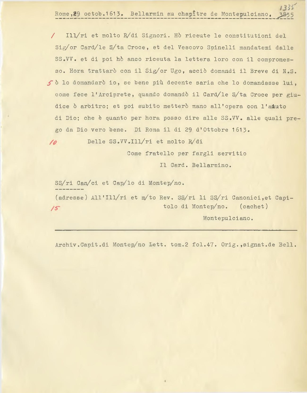 Ill.ri et molto R.di Signori. Hò riceute le constitutioni del Sig.or Card.le S.ta Croce, et del Vescovo Spinelli mandatemi dalle SS. VV. et di poi hò anco riceuta la lettera loro con il compromesso. Hora trattarò con il Sig.or Ugo, acciò domandi il Breve di N. S. lo domandarò io, se bene più decente saria che lo domandasse lui, come fece l'Arciprete, quando domandò il Card.le S.ta Croce per giudice ò arbitro; et poi subito metterò mano all'opera con l'aiuto di Dio; che è quanto per hora posso dire alle SS. VV. alle quali prego da Dio vero bene. Di Roma il di 29 d'Ottobre 1613.