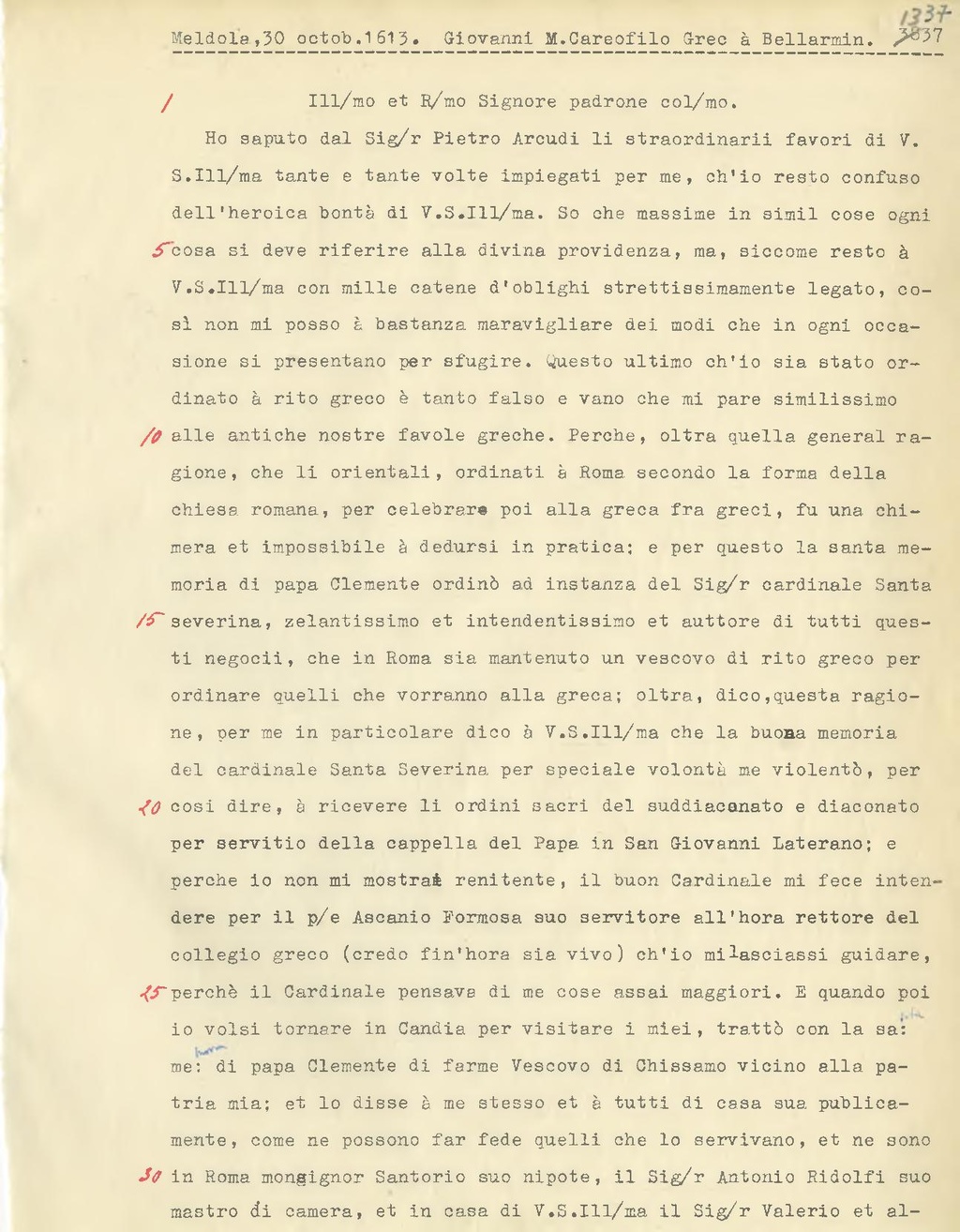 Ho saputo dal Sig.r Pietro Arcudi li straordinarii favori di V.S. Ill.ma tante e tante volte impiegati per me, ch'io resto confusodell'heroica bontà di V.S. Ill.ma. So che massime in simil cose ogni cosa si deve riferire alla divina previdenza, ma, siccome resto à V.S. Ill.ma con mille catene d'oblighi strettissimamente legato, così non mi posso à bastanza maravigliare dei modi che in ogni occasione si presentano per sfugire. Questo ultimo ch'io sia stato ordinato à rito greco è tanto falso e vano che mi pare similissimo alle antiche nostre favole greche. Perche, oltra quella general ragione, che li orientali, ordinati à Roma secondo la forma della chiesa romana, per celebrare poi alla greca fra greci, fu una chimera et impossibile à dedursi in pratica; e per questo la santa memoria di papa Clemente ordinò ad instanza del Sig.r cardinale Santa severina, zelantissimo et intendentissimo et auttore di tutti questi negocii, che in Roma sia mantenuto un vescovo di rito greco per ordinare quelli che vorranno alla greca; oltra, dico, questa ragione, per me in particolare dico à V. S. Ill.ma che la buona memoria del cardinale Santa Severina per speciale volontà me violentò, per così dire, à ricevere li ordini sacri del suddiaconato e diaconato per servitio della cappella del Papa in San Giovanni Laterano; e perche io non mi mostrai renitente, il buon Cardinale mi fece intendere per il p.e Ascanio Formosa suo servitore all'hora rettore del collegio greco (credo fin'hora sia vivo) ch'io mi lasciassi guidare, perchè il Cardinale pensava di me cose assai maggiori. E quando poi io volsi tornare in Candia per visitare i miei, trattò con la santa memoria di papa Clemente di farme Vescovo di Chissamo vicino alla patria mia; et lo disse à me stesso et à tutti di casa sua publicamente, come ne possono far fede quelli che lo servivano, et ne sono in Roma mongignor Santorio suo nipote, il Sig.r Antonio Ridolfi suo mastro di camera, et in casa di V. S. Ill.ma il Sig.r Valerio et altri