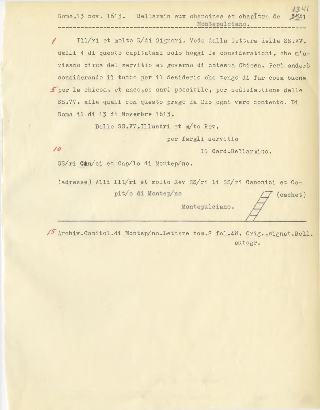Ill. ri et molto R. di Signori. Vedo dalla lettera delle SS. VV. delli 4 di questo capitatami solo hoggi le consideretioni, che m'avisano circa del servitio et governo di cotesta Chiesa. Però anderò considerando il tutto per il desiderio che tengo di far cosa buona per la chiesa, et anco, se sarà possibile, per sodisfattione delle SS.VV. alle quali con questo prego da Dio ogni vero contento. Di Roma il di 13 di Novembre 1613.