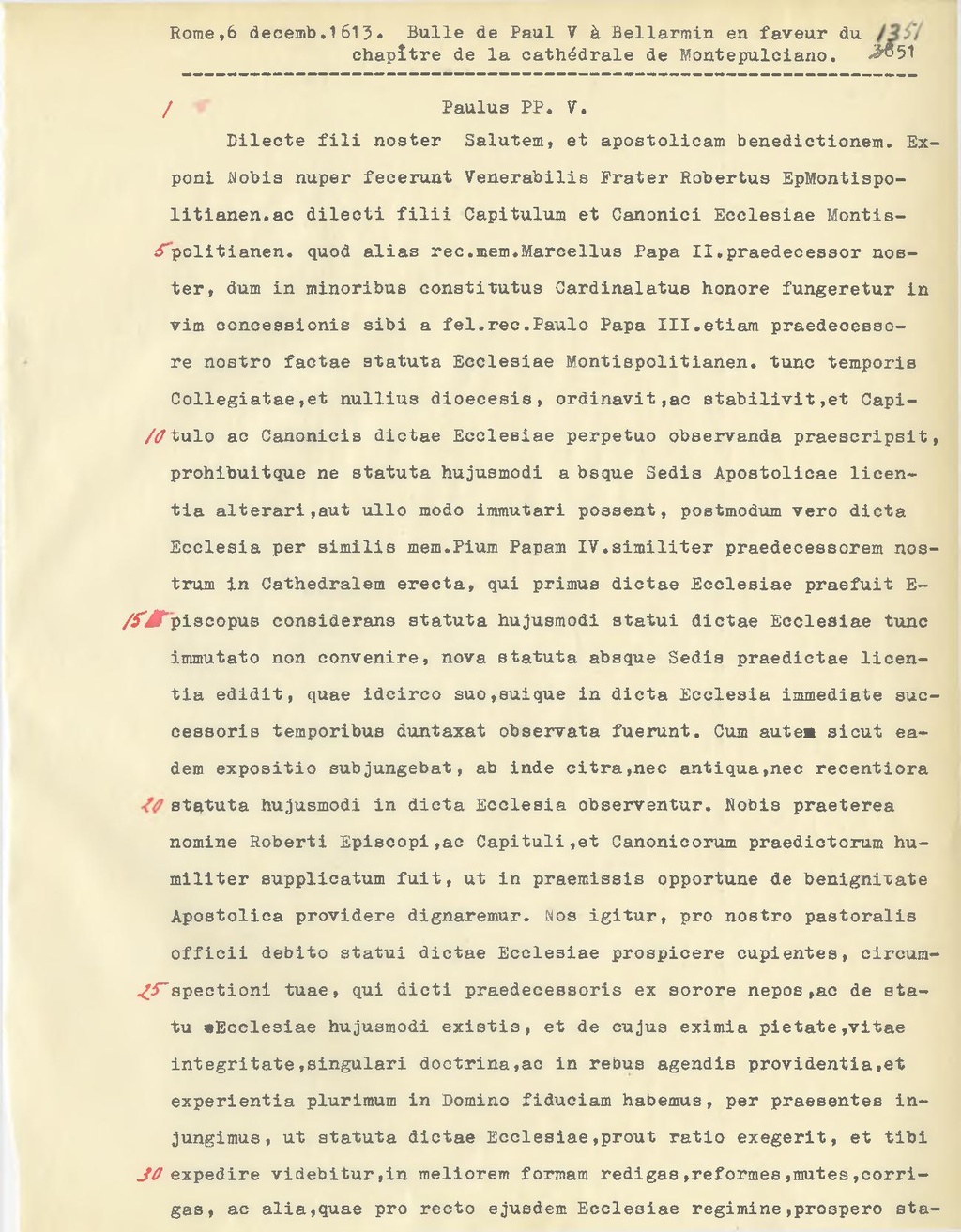 Dilecte fili noster Salutem, et apostolicam benedictionem. Exponi Nobis nuper fecerunt Venerabilis Frater Robertus EpMontispolitianen.ac dilecti filii Capitulum et Canonici Ecclesiae Montispolitianen. quod alias rec. mem. Marcellus Papa II. praedecessor noster, dum in minoribus constitutus Cardinalatus honore fungeretur in vim concessionis sibi a fel. rec.Paulo Papa III. etiam praedecessore nostro factae statuta Ecclesiae Montispolitianen. tunc temperie Collegiatae, et nullius dioecesis, ordinavit, ac stabilivit, et Capitulo ac Canonicis dictae Ecclesiae perpetuo observanda praescripsit, prohibuitque ne statuta hujusmodi absque Sedis Apostolicae licentia alterari, aut ullo modo immutari possent, postmodum vero dieta Ecclesia per similis mem.Pium Papam IV. similiter praedecessorem nos trum in Cathedralem erecta, qui primus dictae Ecclesiae praefuit Episcopus considerane statuta hujusmodi statui dictae Ecclesiae tunc immutato non convenire, nova statuta absque Sedis praedictae licentia edidit, quae idcirco suo, suique in dieta Ecclesia immediate suc cessorie temporibus duntaxat observata fuerunt. Cum autea sicut eadem expositio subjungebat, ab inde citra, nec antiqua, nec recentiora statuta hujusmodi in dieta Ecclesia observentur. Nobis praeterea nomine Roberti Episcopi, ac Capitoli, et Canonicorum praedictorum humiliter supplicatum fuit, ut in praemissis opportune de benignitate Apostolica previdero dignaremur. Nos igitur, pro nostro pastoralis officii debito statui dictae Ecclesiae prospicere cupientes, circumspectioni tuae, qui dicti praedecessoris ex sorore nepos, ac de stato Ecclesiae hujusmodi existis, et de cujus eximia piotate, vitae integritele, singolari doctrina,ac in rebus agendis providentia,et experientia plurimum in Domino fiduciam habemus, per praesentes injungimus, ut statuta dictae Ecclesiae, prout ratio exegerit, et tibi expedire videbitur, in meliorem formam redigas, reformes, mutes, corrigas, ac alia, quae pro recto ejusdem Ecclesiae regimine, prospero statu