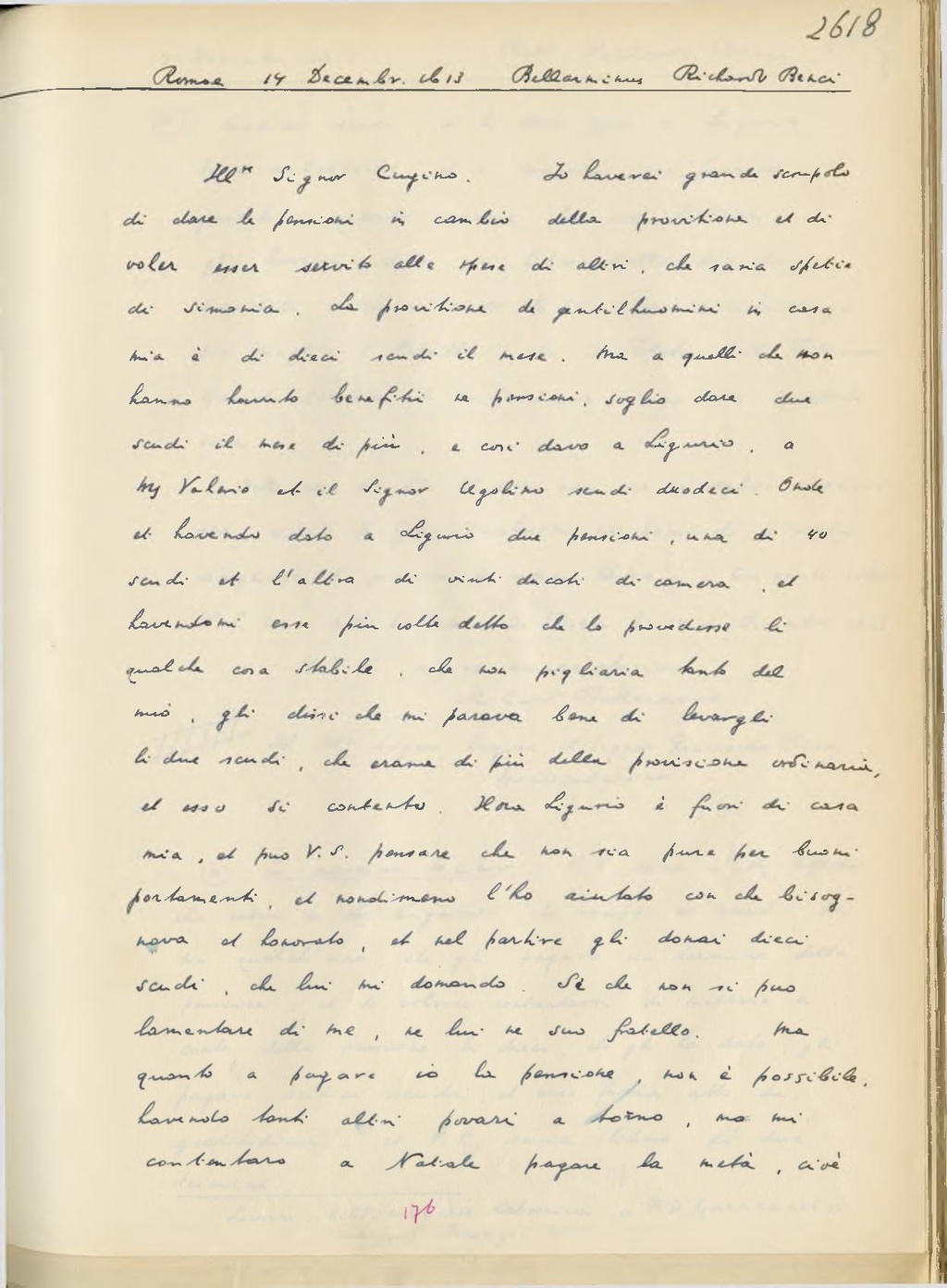 Ill.re Signor cugino. Io haverei grande scrupolo di dare le pensioni in cambio della provitione et di voler esser servito alle spese di altri, che saria spetis di simonia. La provitione di gentilhuomini in casa mia è di 10 scudi al mese. Ma a quelli che non hanno avuto benefitii ne pensioni voglio dare due scudi il mese di più, e così davo a Ligurio a Ms Valerio et il Signor Ugolino scudi duodeci. Onde et havendo dato a Ligurio due pensioni, una di 40 scudi et l'altra di venti ducati di ca... et havendomi essi più volte detto che lo provedesse li qualche cosa stabile che non pigliaria tanto del mio, gli dissi che mi pareva bene di levargli li due scudi, che erano di più della provisione ordinaria, et esso si contento. Hora Ligurio è fuori di casa mia, et puo V.S. pensare che non sia per buoni portamenti, et nondimeno l'ho aiutato con che bisognava et honorato, et nel partire gli donai dieci scudi, che lui mi domando. Si che non si puo lamentare di me, ne lui ne suo fratello. Ma quanto a pagare io la pensione, non è possibile havendo tanti altri poveri a torno, ma mi contentaro a Natale pagare la metà, cioè