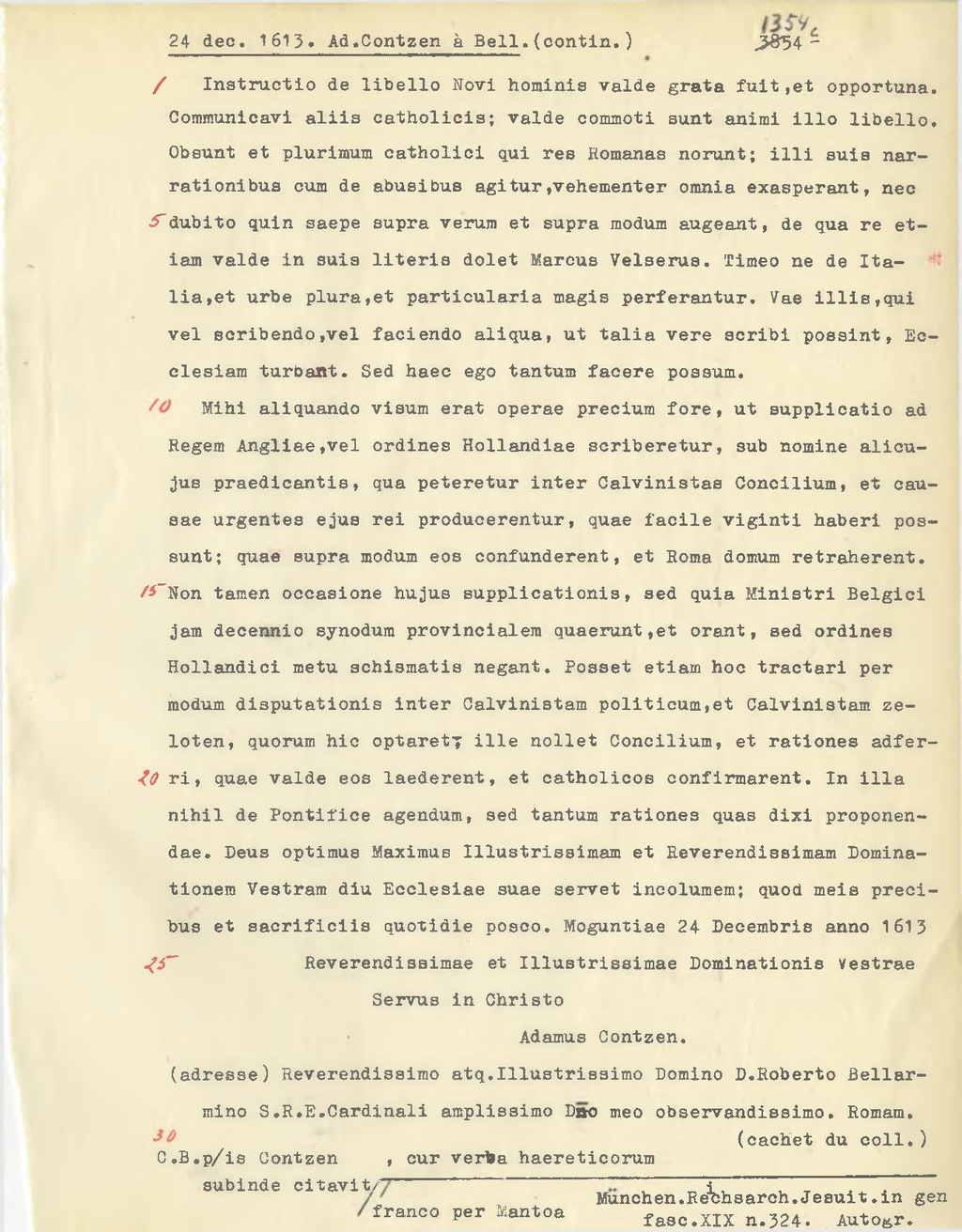 Mihi aliquando visum erat operae precium fore, ut supplicatio ad Regem Angliae, vel ordines Hollandiae scriberetur, sub nomine alicujus praedicantis, qua peteretur inter Calvinistas Concilium, et causae urgentes ejus rei producerentur, quae facile viginti haberi possunt; quae supra modum eos confunderent, et Roma domum retraherent. Non tamen occasione hujus supplicationis, sed quia Ministri Belgici jam decennio synodum provincialem quaerunt, et orant, sed ordines Hollandici metu schismatis negant. Posset etiam hoc tractari per modum disputationis inter Calvinistam politicum, et Calvinistam zeloten, quorum hic optaret ille nollet Concilium, et rationes adferri, quae valde eos laederent, et catholicos confirmarent. In illa nihil de Pontifice agendum, sed tantum rationes quas dixi proponendae. Deus optimus Maximus Illustrissimam et Reverendissimam Dominationem Vestram diu Ecclesiae suae servet incolumem; quod meis precibus et sacrificiis quotidie pesco. Moguntiae 24 Decembris anno 1613