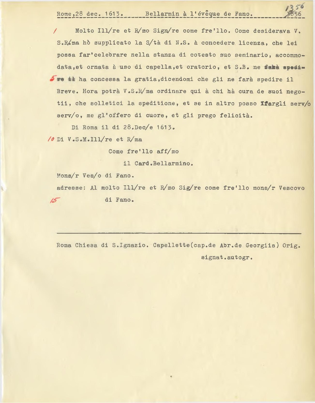 Al molto Ill.re et R.mo Sig.re come fre.llo mons.r Vescovo di Fano.