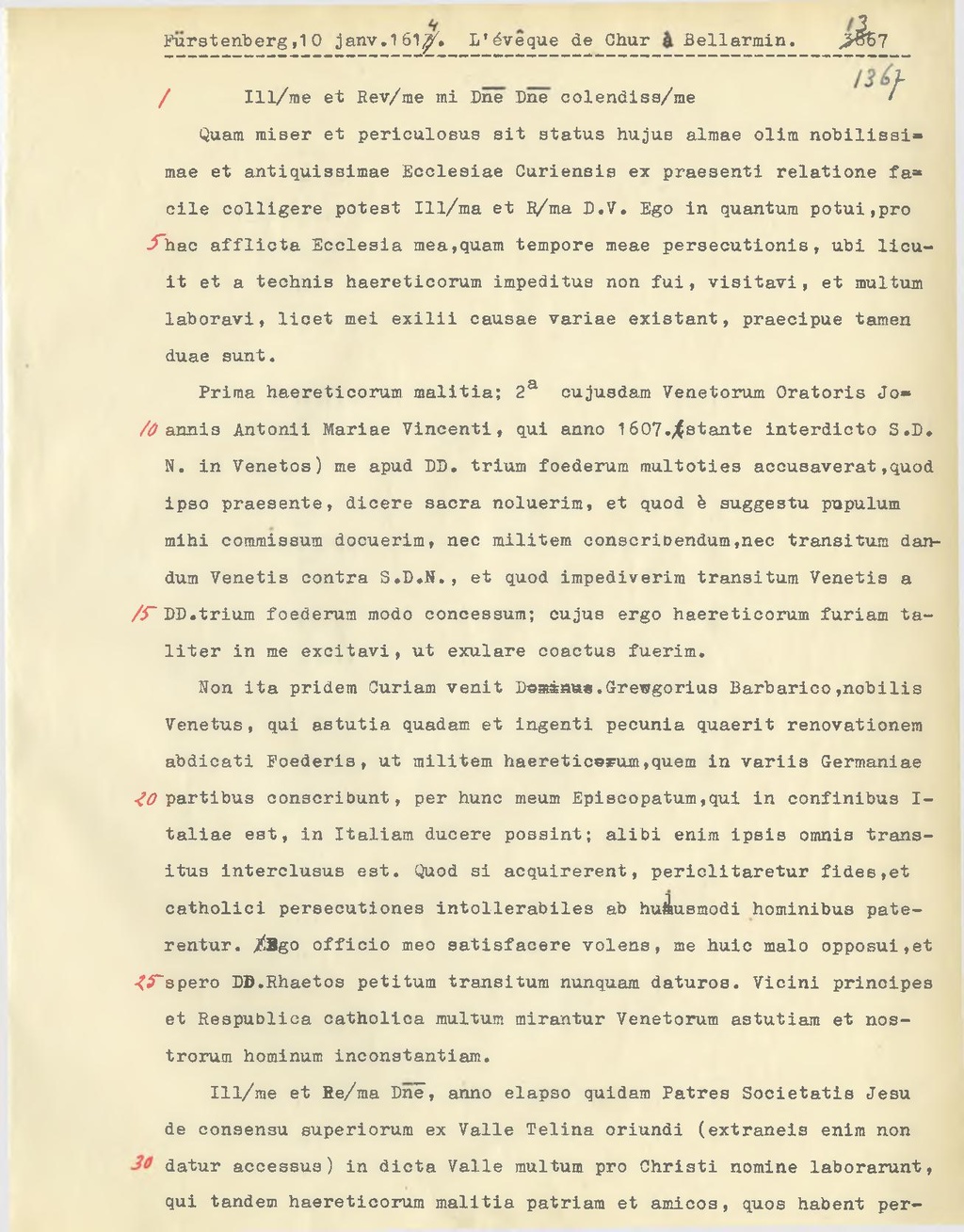 Non ita pridem Curiam venit Dominus. Gregorius Barbarico, nobilis Venetus, qui astutia quadam et ingenti pecunia quaerit renovationem abdicati Foederis, ut militem haereticorum, quem in variis Germaniae partibus conscribunt, per hunc meum Episcopatum, qui in confinibus Italiae est, in Italiam ducere possint; alibi enim ipsis omnia transitus interclusus est. Quod si acquirerent, periclitaretur fides, et catholici persecutiones intollerabilis ab huiusmodi hominibus paterentur. Ego officio meo satisfacere volens, me huic malo opposui, et spero DD. Rhaatos petitum transitum nunquam daturos. Vicini principes, et Respublica catholica multum mirantur Venetorum astutiam et nostrorum hominum inconstantiam.