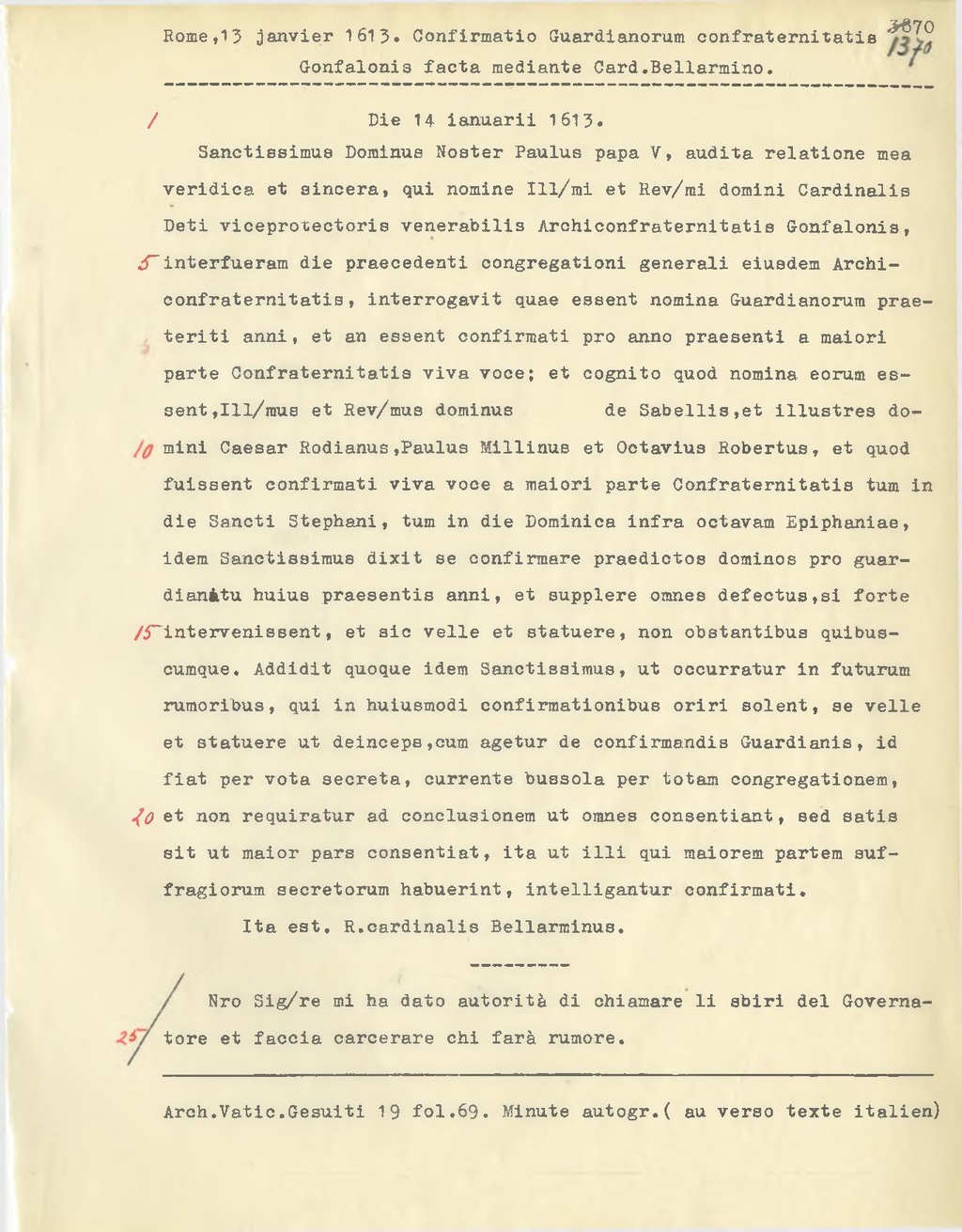 Sanctissimus Dominus Noster Paulus papa V, audita relatione mea veridica et sincera, qui nomine Ill.mi et Rev.mi domini Cardinalis Deti viceprotectoris venerabilis Archiconfraternitatis Gonfalonis[1], interfueram die praecedenti congregationi generali eiusdem Archiconfraternitatis, interrogavit quae essent nomina Guardianorum praeteriti anni, et an essent confirmati pro anno praesenti a maiori parte Confraternitatis viva voce; et cognito quod nomina eorum essent, Ill.mus et Rev.mus dominus de Sabellis, et illustres domini Caesar Rodianus, Paulus Millinus et Octavius Hubertus, et quod fuissent confirmati viva voce a malori parte Confraternitatis tum in die Sancti Stephani, tum in die Dominion infra octavam Epiphaniae, idem Sanctissimus dixit se confirmare praedictos dominos pro guardianatu huius praesentis anni, et supplere omnes defectus, si forte intervenissent, et sic velle et statuere, non obstantibus quibuscumque. Addidit quoque idem Sanctissimus, ut occurratur in futurum rumoribus, qui in huiusmodi confirmationibus oriri solent, se velle et statuere ut deinceps, cum agetur de confirmandis Guardianis, id fiat per vota secreta, currente bussola per totem congregationem, et non requiratur ad conclusionem ut omnes consentiant, sed satis sit ut maior pars consentiat, ita ut illi qui maiorem partem suffragiorum secretorum habuerint, intelligantur confirmati.