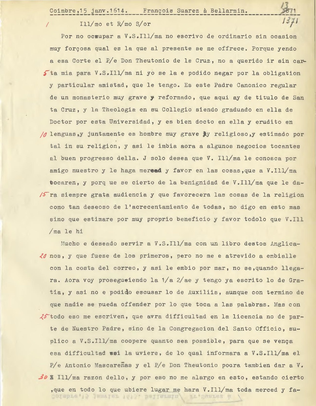 Mucho e deseado servir a V.S. Ill.ma con un libro destos Anglicanos, y que fuese de los primeros, pero no me e atrevido a embialle con la costa del correo, y asi le embio por mar, no se, quando llegara. Aora voy proseguiendo la l.a 2.ae y tengo ya escrito lo de Gratia, y asi no e podido escusar lo de Auxiliis, aunque con termino de que nadie se pueda offender por lo que toca a las palabras. Mas con todo eso me escriven, que avra difficultad en la licencia no de parte de Nuestro Padre, sino de la Congregacion del Santo Officio, suplico a V.S. Ill.ma coopere quanto sea possible, para que se vença esa difficultad si la uviere, de lo qual informara a V.S. Ill.ma el P.e Antonio Mascareñas y el P.e Don Theutonio poura tambien dar a V. Ill.ma razon dello, y por eso no me alargo en esto, estando cierto, que en todo lo que ubiere lugar me hara V. Ill.ma toda merced y favor