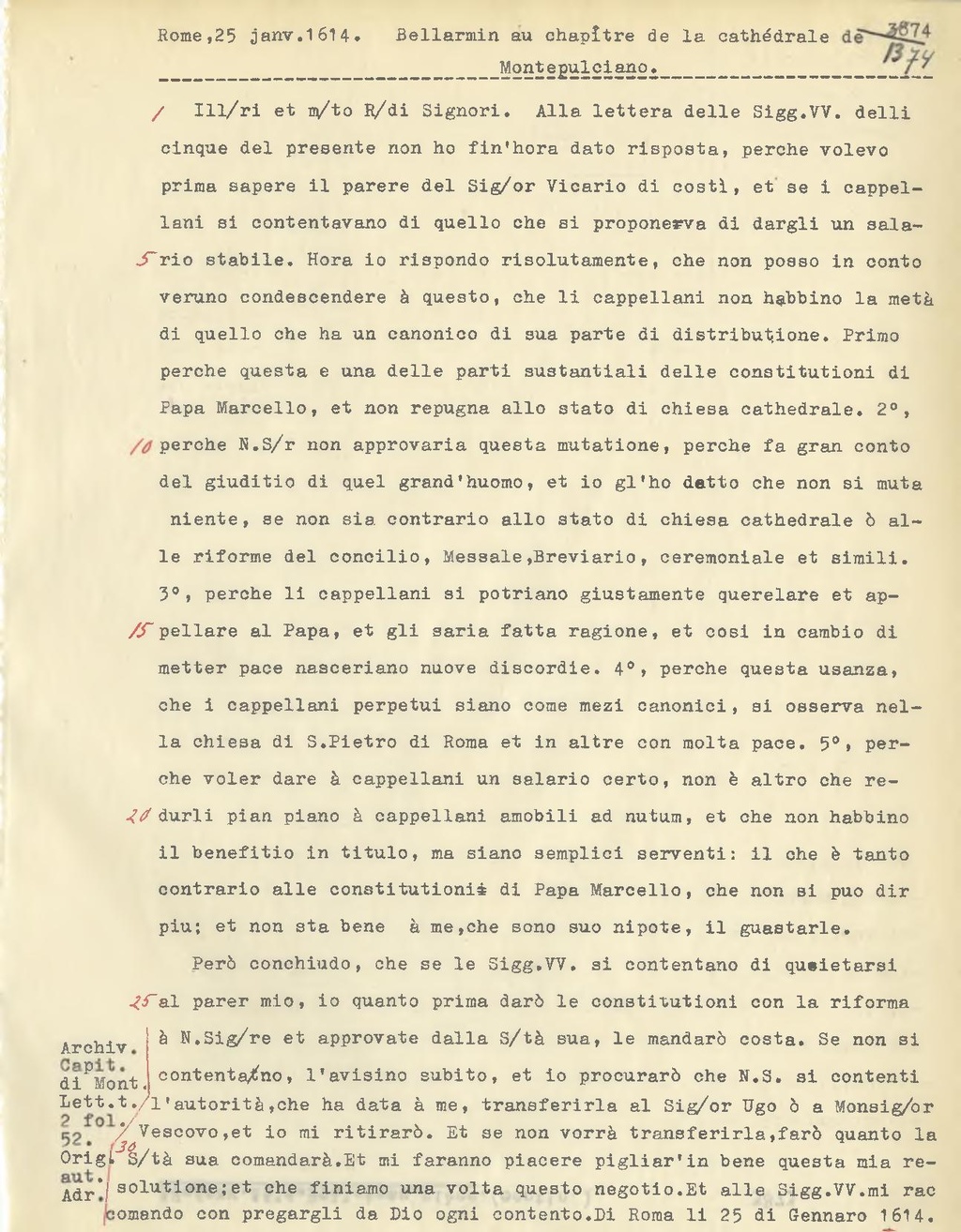 Ill.ri et m.to R.di Signori. Alla lettera delle Sigg.VV. dalli cinque del presente non ho fin'hora dato risposta, perche volevo prima sapere il parere del Sig.or Vicario di costì, et se i cappellani si contentavano di quello che si proponeva di dargli un salario stabile. Hora io rispondo risolutamente, che non posso in conto veruno condescendere a questo, che li cappellani non habbino la meta di quello che ha un canonico di sua parte di distribuzione. Primo perché questa è una delle parti sustantiali delle constitutioni di Papa Marcello, et non repugna allo stato di chiesa cathedrale. 2o, perché N.S.r non approvaria questa mutazione, perché fa gran conto del giuditio di quel grand'uomo, et io gl'ho detto che non si muta niente, se non sia contrario allo stato di chiesa cathedrale e alle riforme del concilio. Messale, Breviario, ceremoniale et simili. 3o perché li cappellani si potriano giustamente querelare et appellare al Papa, et gli saria fatta ragione, et così in cambio di metter pace nasceriano nuove discordie. 4o perché questa usanza, che i cappellani perpetui siano come mezi canonici, si osserva nella chiesa di S.Pietro di Roma et in altre con molta pace. 5o, perché voler dare ai cappellani un salario certo, non è altro che redurli pian piano a cappellani amobili ad nutum, et che non habbino il benefitio in titulo, ma siano semplici serventi: il che è tanto contrario alle constitutioni di Papa Marcello, che non si può dir più; et non sta bene a me, che sono suo nipote, il guastarle.