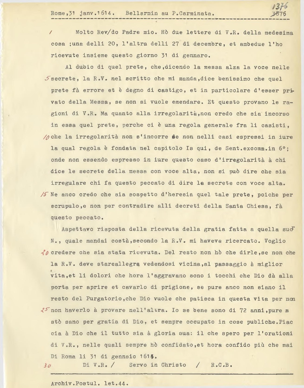 Al dubio di quel prete, che, dicendo la messa alza la voce nelle secrete, la R. V. nel scritto che mi manda, dice benissimo che quel prete fà errore et è degno di castigo, et in particolare d'esser privato della Messa, se non si vuole emendare. Et questo provano le ragioni di V.R. Ma quanto alla irregolarità, non credo che sia incorso in essa quel prete, perche ci è una regola generale fra li casisti[1], che la irregolarità non s'incorre de non nelli casi espressi in iure la qual regola è fondata nel capitolo Is qui, de Sent. ex comm. in 6o; onde non essendo espresso in iure questo caso d'irregolarità à chi dice le secrete della messa con voce alta, non si può dire che sia irregulare chi fa questo peccato di dire la secrete con voce alta.