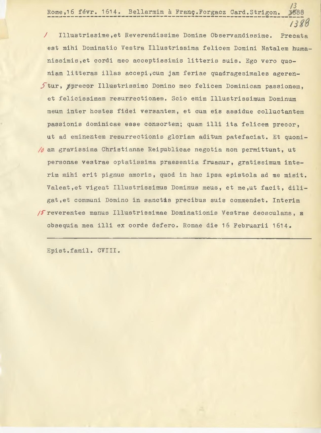 Illustrissime, et Reverendissime Domine Observandissime. Precata est mihi Dominatio Vestra Illustrissima felicem Domini Natalem humanissimis, et cordi meo acceptissimis litteres suis. Ego vero quoniam litteras illas accepi, cum jam feriae quadragesimales agerentur, precor Illustrissimo Domino meo felicem Dominicam passionem, et felicissimam resurrectionem. Scio enim Illustrissimum Dominum meum inter hostes fidei versantem, et cum eis assidue colluctantem passionis dominicae esse consortem; quam illi ita felicem precor, ut ad eminentem resurrectionis gloriam aditum patefaciat. Et quoniam gravissima Christianae Reipublicae negotia non permittunt, ut personae vestrae optatissima praesentia fruamur, gratissimum interim mihi erit pignus amoris, quod in hac ipsa epistola ad me misit. Valeat, et vigeat Illustrissimus Dominus meus, et me, ut fecit, diligat, et communi Domino in sanctis precibus suis commendet. Interim reverentes manus Illustrissimae Dominationis Vestrae deosculans, obsequia mea illi ex corde defero. Romae die 16 Februarii 1614.
