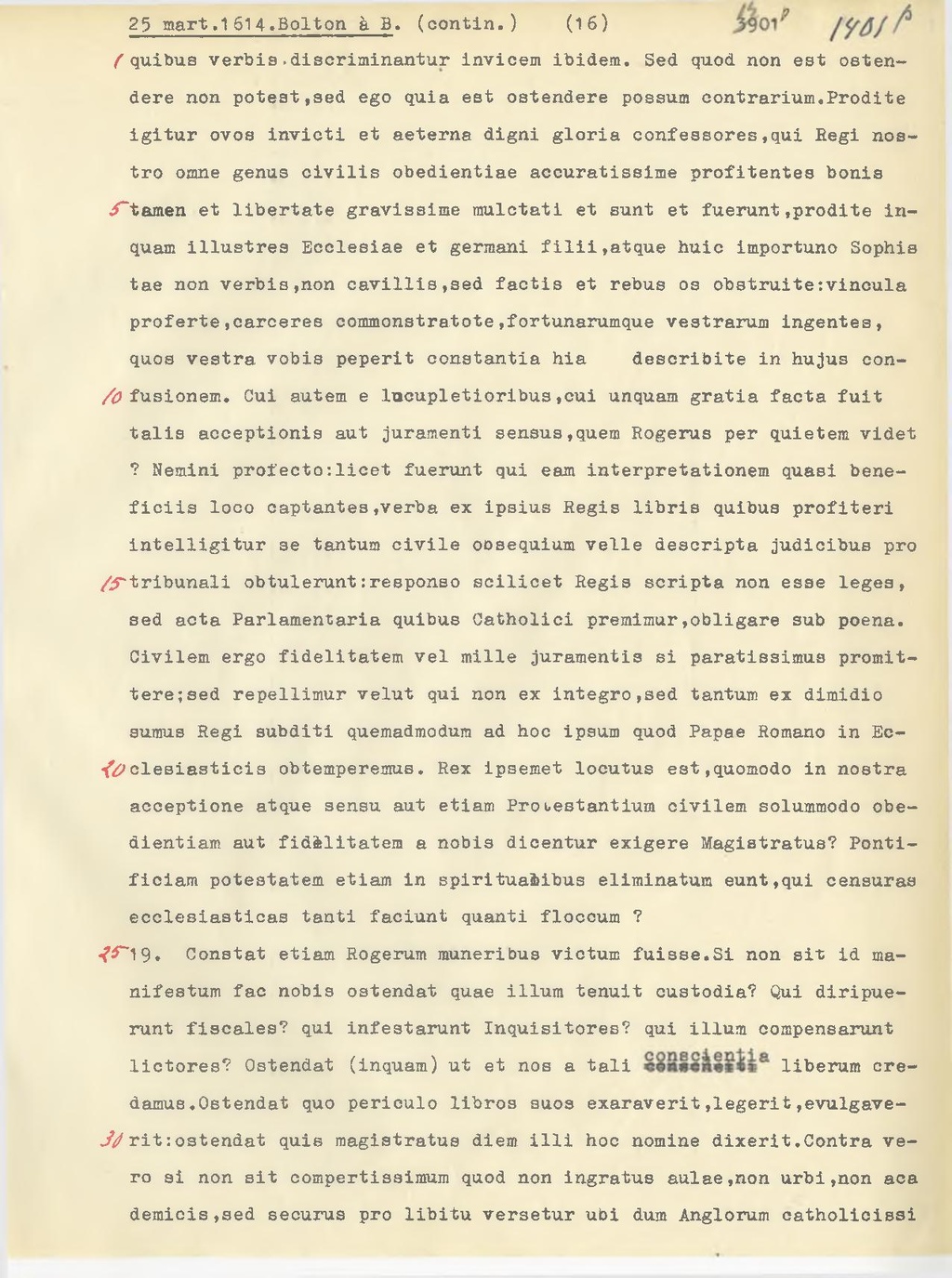 quibus verbis discriminantur invicem ibidem. Sed quod non est estendere non potest, sed ego quia est estendere possum contrarium. Prodite igitur ovos invicti et aeterna digni gloria confessores, qui Regi nostro omne genus civilis obedientiae accuratissime profitentes bonis tamen et libertate gravissime mulctati et sunt et fuerunt, prodite inquam illustres Ecclesiae et germani filii, atque huic importuno Sophistae non verbis, non cavillis, sed factis et rebus os obstruite: vincula proferte, carceres commonstratote, fortunarumque vestrarum ingentes, quos vestra vobis peperit constantia hia describte in hujus confusionem. Cui autem e lucupletioribus, cui unquam gratia facta fuit talis acceptionis aut juramenti sensus,quem Rogerus per quietem videt? Nomini profecto: leget fuerunt qui eam interpretationem quasi beneficiis loco captantes, verba ex ipsius Regis libris quibus profiteri intelligitur se tantum civile obsequium velle descripta judicibus pro tribunali obtulerunt: responso scilicet Regia scripta non esse leges, sed acta Parlamentaria quibus Catholici premimur, obligare sub poena. Civilem ergo fidelitatem vel mille juramentis si paratissumus promittere; sed repellimur veiut qui non ex integro, sed tantum ex dimidio sumus Regi subditi quemadmodum ad hoc ipsum quod Papae Romano in Ecclesiasticis obtemperemus. Rex ipsemet locutus est, quomodo in nostra acceptione atque sensu aut etiam Protestantium civilem solummodo obedientiam aut fidelitatem a nobis dicentur exigere Magistratus? Pontificiam potestatem etiam in spirituabibus eliminatum eunt, qui censuras ecclesiasticas tanti faoiunt quanti floccum?