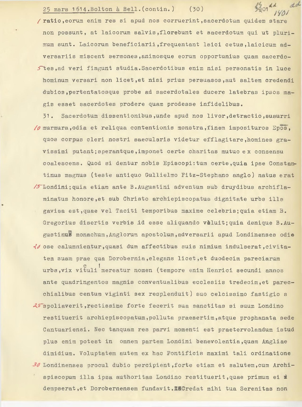 31. Sacerdotum dissentionibus,unde apud nos livor, detractio, susurri murmura, odia et reliqua contentionis monstra, finem imposituros Epos quos corpus cleri nostri saecularis videtur efflagitare, homines gravissimi putant; sperantque, imponet certe charitas mutuo ex consensu coalescens. Quod si dentur nobis Episoopi: tum certe, quia ipse Constantinus magnus (teste antiquo Gullielmo Fitz-Stephano anglo) natus erat Londini; quia etiam ante B. Augustini adventum sub druydibus archiflaminatus honore, et sub Christo archiepiscopatus dignitate urbs illa gavisa est, quae vel Taciti temporibus maxime Celebris; quia etiam B. Gregorius disertis verbis id esse aliquando voluit; quia denique B. Augustinum monachum, Anglorum apostolum, adversarii apud Londinenses odiose calumnientur, quasi dum affectibus suis nimium indulserat, civitatem suam prae qua Dorobernia, elegans licet, et duodecim pareciarum urbs, vix viculi mereatur nomen (tempore enim Henrici secundi annos ante quadringentos magnis conventualibus ecclesiis tredecim, et parecchialibus centum viginti sex resplenduit) suo celcissomo fastigio spoliaverit, rectissime forte fecerit sua sanctitas si suum Londino restituerit archiepiscopatum, polluta praesertim, atque prophanata sede Cantuariensi. Nec tanquam res parvi momenti est praetervolandum istud plus enim potest in omnem partem Lendini benevolentia, quam Angliae dimidium. Voluptatem autem ex hac Pontificie maximi tali ordinatione Londinenses procul dubio percipient, forte etiam et salutem, cum Archispiscopum illa ipsa authoritas Londino restituerit, quae primum ei dempserat, et Dorobernensem fundavit. Credat mihi tua Serenitas non