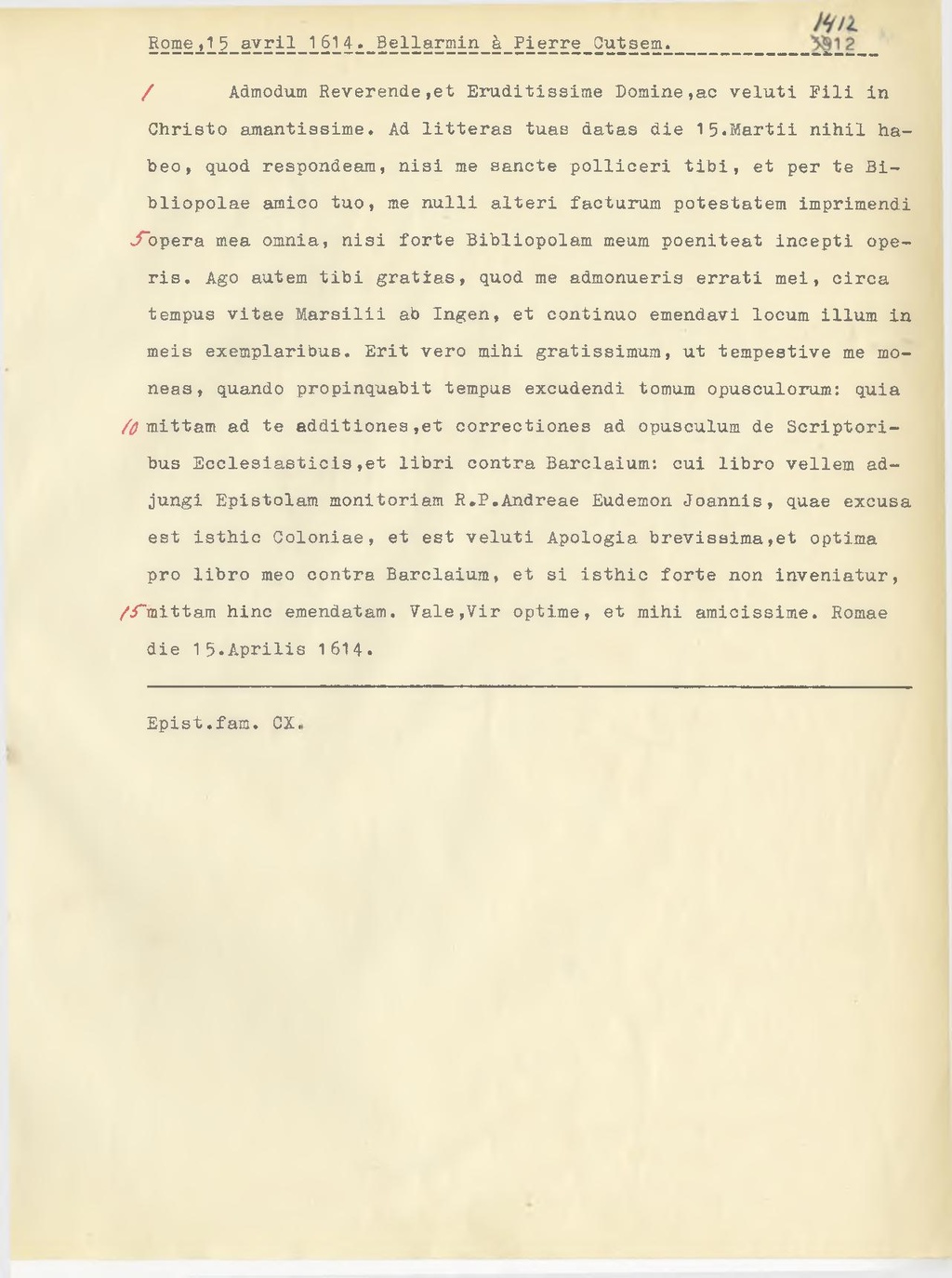 Admodum Reverende, et Eruditissime Domine, ac veluti Fili in Christo amantissime. Ad litteras tuas datas die 15. Martii nihil habeo, quod respondeam, nisi me sancte polliceri tibi, et per te Bibliopolae amico tuo, me nulli alteri facturum potestatem imprimenti bpera mea omnia, nisi forte Bibliopolam meum poeniteat incepti operis. Ago autem tibi gratias, quod me admonueris errati mei, circa tempus vitae Marsilii ab Ingen, et continuo emendavi locum illum in mais exemplaribus. Erit vero mihi gratissimum, ut tempestive me moneas, quando propinquabit tempus excudendi tomum opusculorum: quia mittam ad te additiones, et correctiones ad opusculum de Scriptoribus Ecclesiasticis,et libri contra Barclaium: cui libro vellem adjungi Epistolam monitoriam R. P. Andreae Eudemon Joannis, quae excusa est isthic Coloniae, et est valuti Apologia brevissima, et optima prò libro meo contra Barclaium, et si isthic forte non inveniatur, mittam hinc emendatam. Vale, Vir optime, et mihi amicissime. Romae die 15. Aprilis 1614.
