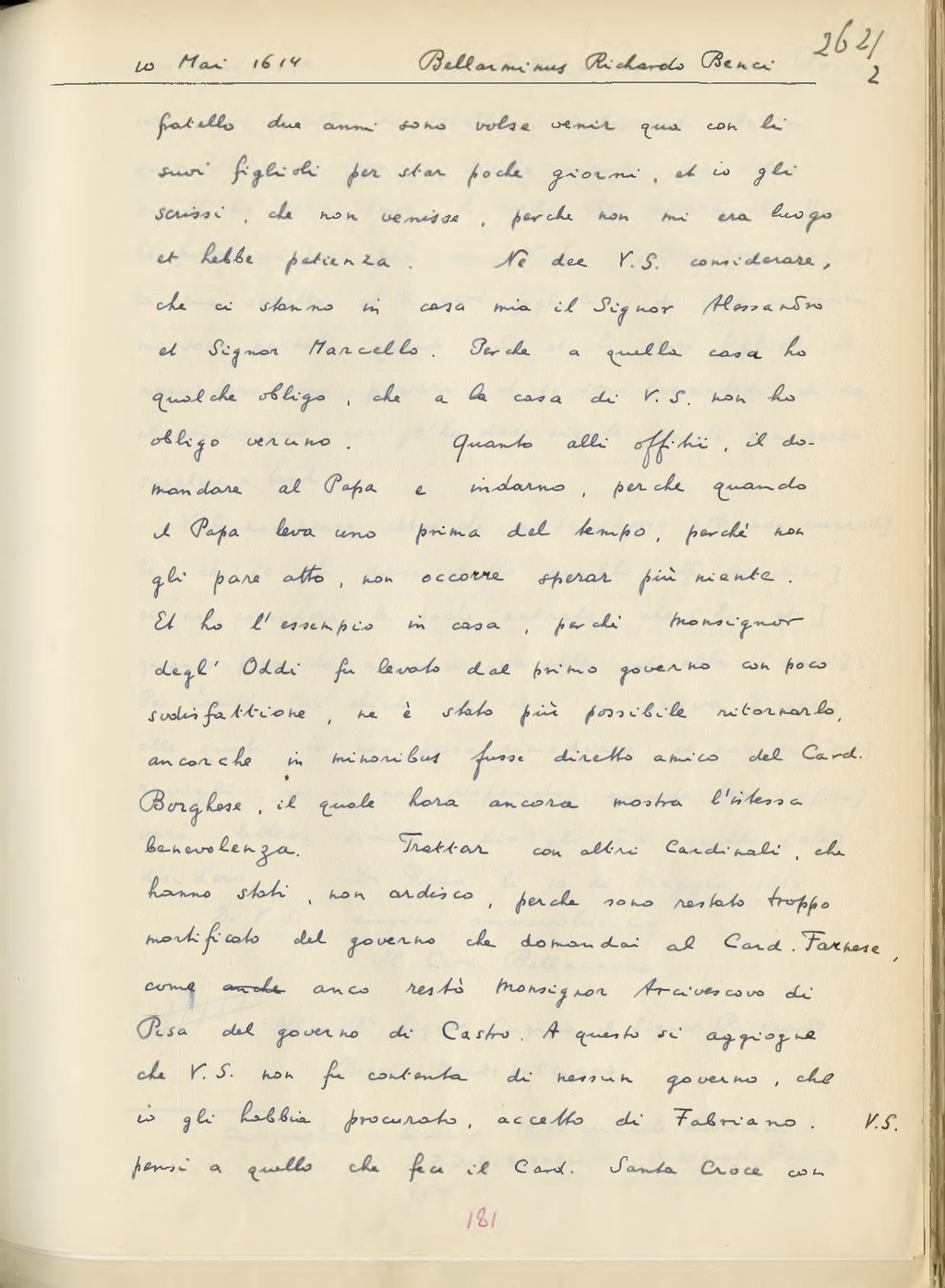 Quanto alli offitii, il domandare al Papa e indarno, perche quando il Papa leva uno prima del tempo, perchè non gli pare atto, non occorre sperar più niente. Et ho l'essempio in casa, perchè Monsignor degli Oddi fu levato dal primo governo con poco sodisfattione, ne è stato più possibile ritornarlo ancorche in minoribus fusse diretto amico del Card. Borghese, il quale hora ancora mostra l'istessa benevolenza.