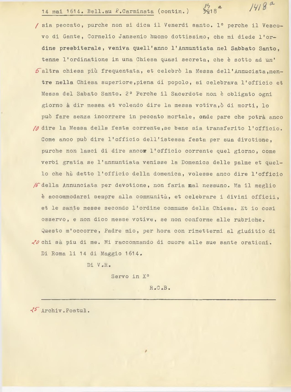 sia peccato, purche non si dica il Venerdi santo. 10 perche il Vescovo di Gante, Cornelio Jansenio huomo dottissimo, che mi diede l'ordine presbiterale, veniva quell'anno l'Annuntiata nel Sabbato Santo, tenne l'ordinatione in una Chiesa quasi secreta, che è sotto ad un'altra chiesa più frequentata, et celebrò la Messa dell'Annuciata, mentre nella Chiesa superiore, piena di popolo, si celebrava l'officio et Messa del Sabato Santo. 20 Perche il Sacerdote non è obligato ogni giorno à dir messa et volendo dire la messa votiva, ò di morti, lo può fare senza incorrere in peccato mortale, onde pare che potrà anco dire la Messa della festa corrente, se bene sia transferito l'officio. Come anco può dire l'officio dell'istessa festa per sua divotione, purche non lasci di dire anco l'officio corrente quel giorno, come verbi gratia se l'annuntiata venisse la Domenica delle palme et quello che hà detto l'officio della domenica, volesse anco dire l'officio della Annunciata per devotione, non faria mal nessuno. Ma il meglio è accommodarsi sempre alla communità, et celebrare i divini officii, et le sante messe secondo l'ordine commune della Chiesa. Et io cosi osservo, e non dico messe votive, se non conforme alle rubriche. Questo m'occorre, Padre mio, per hora con rimettermi al giuditio di chi sà piu di me. Mi raccommando di cuore alle sue sante orationi. Di Roma li 14 di Maggio 1614.