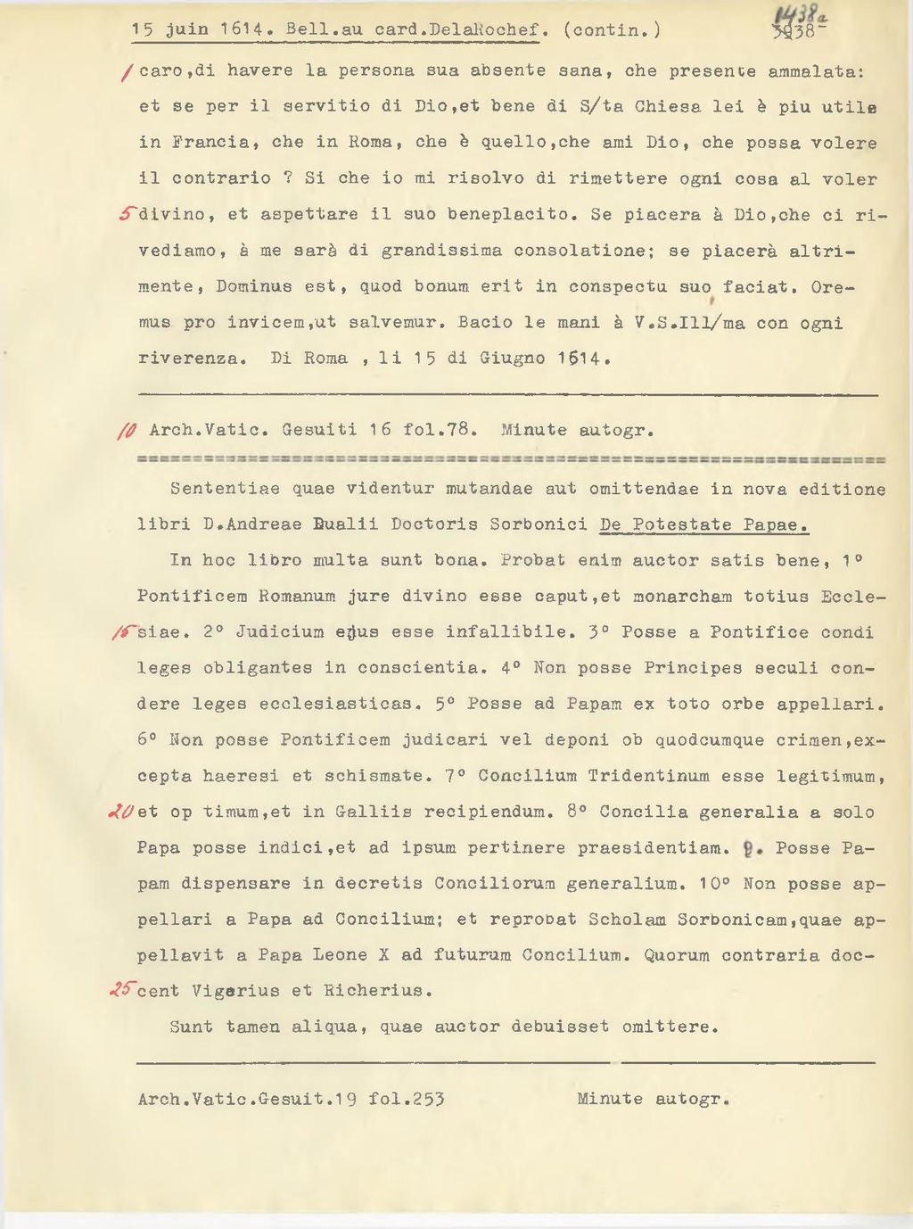 caro, di havere la persona sua absente sana, che presente ammalata: et se per il servitio di Dio, et bene di S.ta Chiesa lei è piu utile in Francia, che in Roma, che è quello, che ami Dio, che possa volere il contrario? Si che io mi risolvo di rimettere ogni cosa al voler divino, et aspettare il suo beneplacito. Se piacera à Dio, che ci rivediamo, à me sarà di grandissima consolatione; se piacerà altrimente, Dominus est, quod bonum erit in conspectu suo faciat. Oremus pro invicem, ut salvemur. Bacio le mani à V.S. Ill.ma con ogni riverenza. Di Roma, li 15 di Giugno 1614.