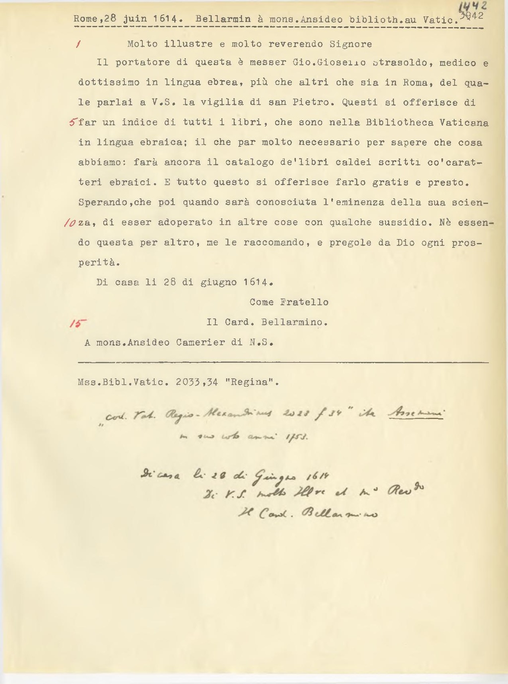 Il portatore di questa è messer Gio. Giosello Strasoldo, medico e dottissimo in lingua ebrea, più che altri che sia in Roma, del quale parlai a V. S. la vigilia di san Pietro. Questi si offerisce di far un indice di tutti i libri, che sono nella Bibliotheca Vaticana in lingua ebraica; il che par molto necessario per sapere che cosa abbiamo: farà ancora il catalogo de' libri caldei scritti co' caratteri ebraici. E tutto questo si offerisce farlo gratis e presto. Sperando, che poi quando sarà conosciuta l'eminenza della sua scienza, di esser adoperato in altre cose con qualche sussidio. Nè essendo questa per altro, me le raccomando, e pregole da Dio ogni prosperità.