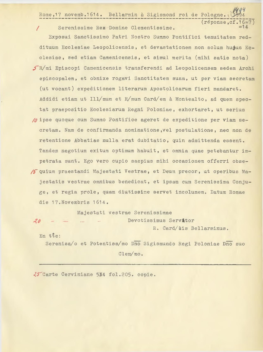 Addidi etiam ut Ill.mum et R.mum Card.em à Montealto, ad quem spectat praepositio Ecclesiarum Regni Poloniae, exhortaret, ut serius ipse quoque cum Summo Pontifico ageret de expeditione per viam secretam. Nam de confirmanda nominatione,vel postulatione, nec non de retentione Abbatiae nulla erat dubitatio, quin admittenda essent. Tandem negotium exitum optimum habuit, et omnia quae petebantur impetrata sunt. Ego vero cupio saepius mihi occasionem offerri obsequium praestandi Majestati Vestrae, et Deum precor, ut operibus Majestatis vestrae omnibus benedicat, et ipsam cum Serenissima Conjuge, et regia prole, quam diurnissime servet incolumem. Datum Romae die 17. Novembris 1614.