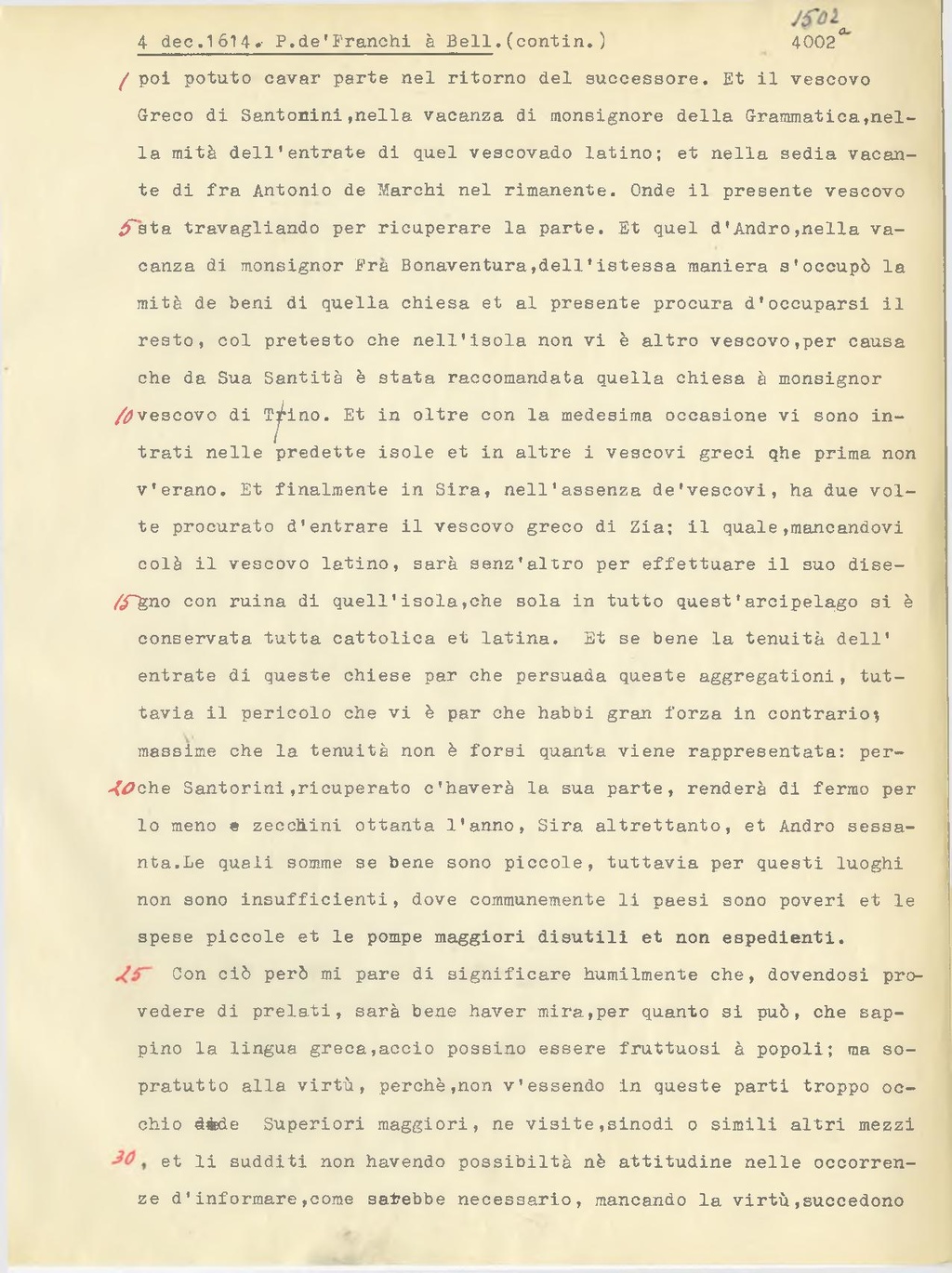 poi potuto cavar parte nel ritorno del successore. Et il vescovo Greco di Santorini, nella vacanza di monsignore della Grammatica, nella mità dell'entrata di quel vescovado latino; et nella sedia vacante di fra Antonio de Marchi nel rimanente. Onde il presente vescovo sta travagliando per ricuperare la parte. Et quel d'Andro, nella vacanza di monsignor Frà Bonaventura, dell'istessa maniera s'occupò la mità de beni di quella chiesa et al presente procura d'occuparsi il resto, col pretesto che nell'isola non vi è altro vescovo, per causa che da Sua Santità è stata raccomandata quella chiesa à monsignor vescovo di Trino. Et in oltre con la medesima occasione vi sono entrati nelle predette isole et in altre i vescovi greci che prima non v'erano. Et finalmente in Sira, nell'assenza de' vescovi, ha due volte procurato d'entrare il vescovo greco di Zia; il quale, mancandovi colà il vescovo latino, sarà senz'altro per effettuare il suo disegno con ruina di quell'isola, che sola in tutto quest'arcipelago si è