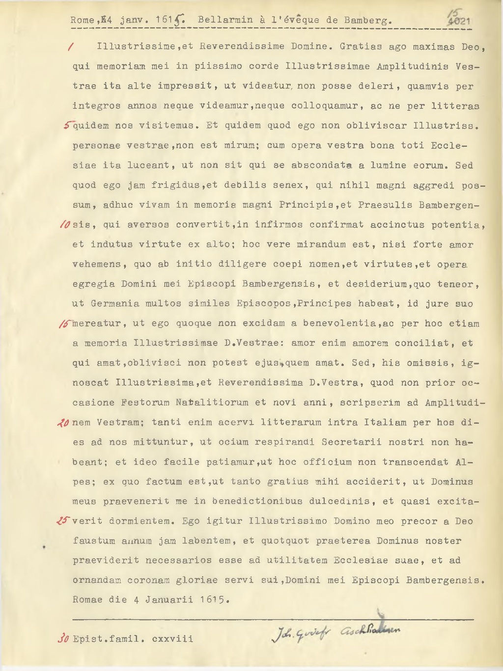 Illustrissime, et Reverendissime Domine. Gratias ago maximas Deo, qui memoriam mei in piissimo corde Illustrissimae Amplitudinis Vestrae ita alte impressit, ut videatur, non posse deleri, quamvis per integros aunos neque videamur, neque colloquamur, ac ne per litteras quidem nos visitemus. Et quidem quod ego non obliviscar Illustriss. personae vestrae, non est mirum; cum opera vestra bona toti Ecclesiae ita luceant, ut non sit qui se abscondata a lumine eorum. Sed quod ego jam frigidus, et debilis senex, qui nihil magni aggredi possum, adhuc vivam in memoria magni Principis, et Praesulis Bambergensis, qui aversos convertit, in infirmos confirmat accinctus potentia, et indutus virtute ex alto; hoc vere mirandum est, nisi forte amor vehemens, quo ab initio diligere coepi nomen, et virtutes, et opera egregia Domini mei Episcopi Bambergensis, et desiderium, quo teneor, ut Germania multos similes Episcopos, Principes habeat, id jure suo mereatur, ut ego quoque non excidam a benevolentia, ac per hoc etiam a memoria Illustrissimae D. Vestrae: amor enim amorem conciliat, et qui amat, oblivisci non potest ejus quem amat. Sed, his omissis, ignoscat Illustrissima, et Reverendissima D.Vestra, quod non prior occasione Festorum Natalitiorum et novi anni, scripserim ad Amplitudinem Vestram; tanti enim acervi litterarum intra Italiam per hos dies ad nos mittuntur, ut ocium respiranti Secretarii nostri non habeant; et ideo facile patiamur, ut hoc officium non transcendat Alpes; ex quo factum est, ut tanto gratius mihi acciderit, ut Dominus meus praevenerit me in benedictionibus dulcedinis, et quasi excitaverit dormientem. Ego igitur Illustrissimo Domino meo precor a Deo faustum annum jam labentem, et quotquot praeterea Dominus noster praeviderit necessarios esse ad utilitatem Ecclesiae suae, et ad ornandam coronam gloriae servi sui, Domini mei Episcopi Bambergensis.
