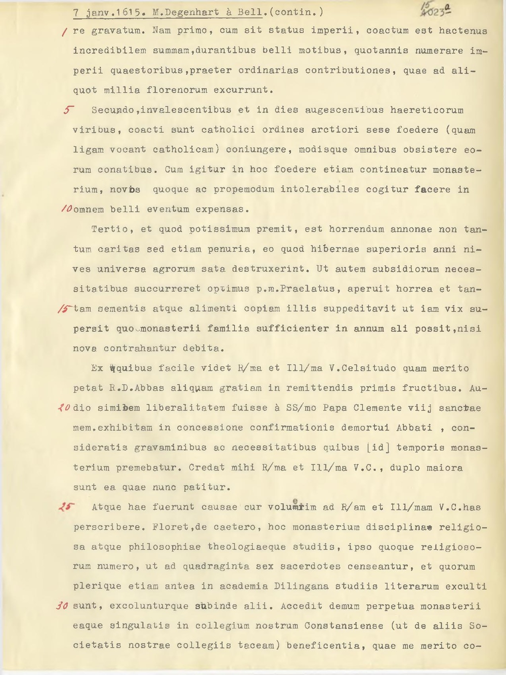 Atque hae fuerunt causae cur voluerim ad R.am et Ill.mam V. C. has perscribere. Floret, de caetero, hoc monasterium disciplina religiosa atque philosophiae theologiaeque studiis, ipso quoque religiosorum numero, ut ad quadraginta sex sacerdotes censeantur, et quorum plerique etiam antea in academia Dilingana studiis literarum exculti sunt, exeolunturque subinde alii. Accedit demum perpetua monasterii eaque singulatis in collegium nostrum Constansiense (ut de aliis Societatis nostrae collegiis taceam) beneficentia, quae me merito cogunt