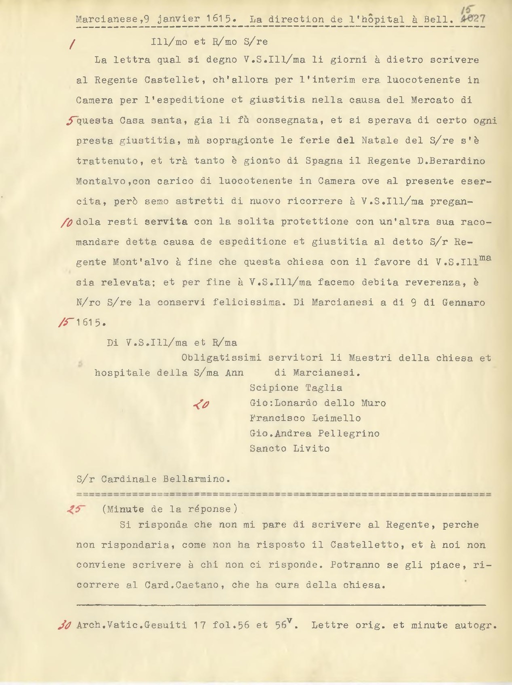 Si risponda che mi pare di scrivere al Regente, perché non rispondaria, come non ha risposto il Castelletto, et à noi non conviene scrivere à chi non ci risponde. Potranno se gli piace, ricorrere al Card. Caetano, che ha cura della chiesa.